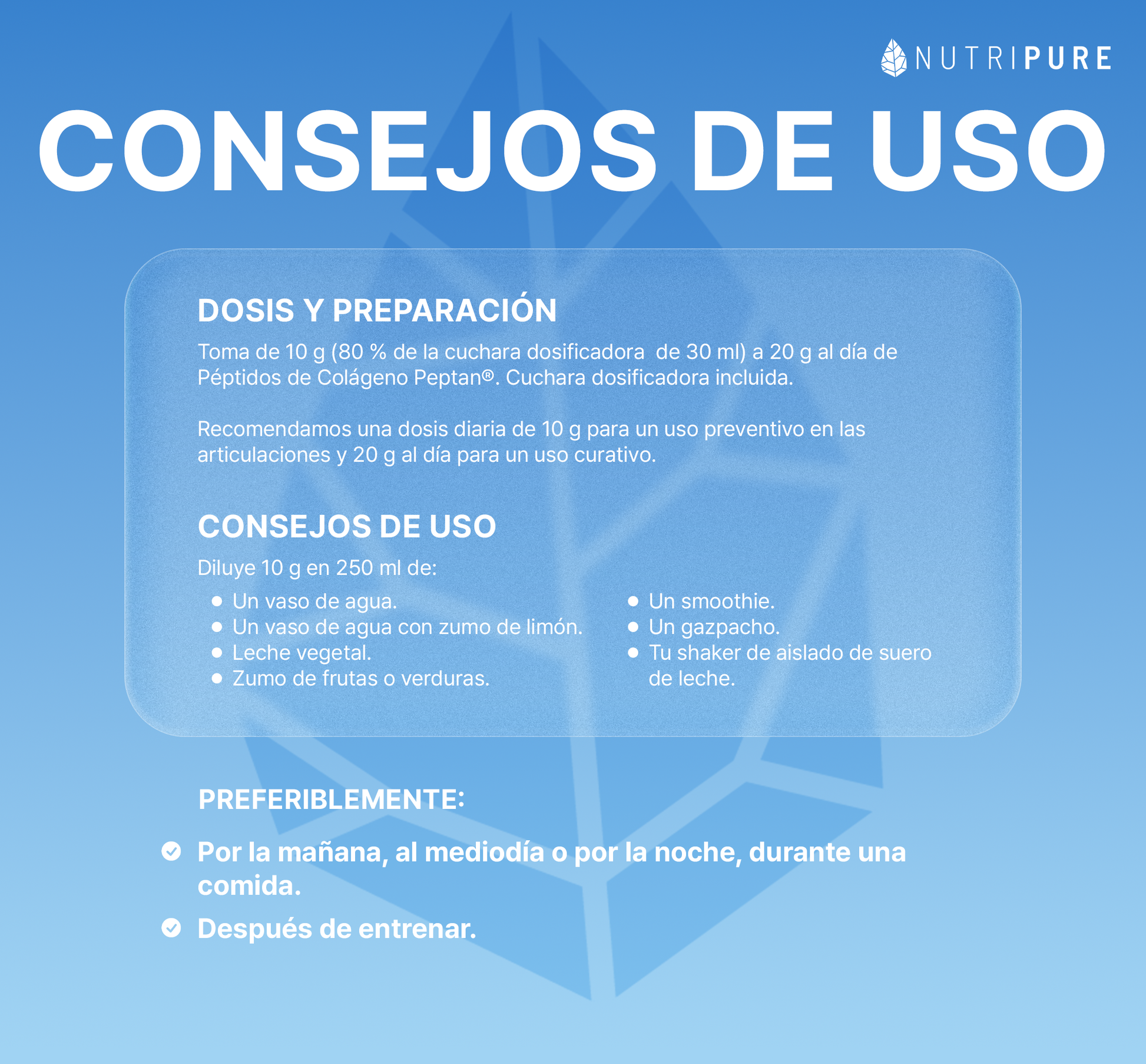🕑 Posología : Tomar entre 10 g y 20 g al día de péptidos de colágeno Peptan. Cuchara dosificadora incluida.