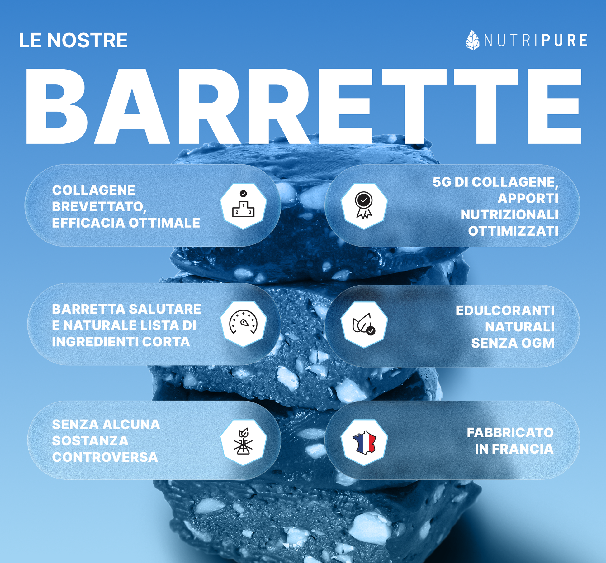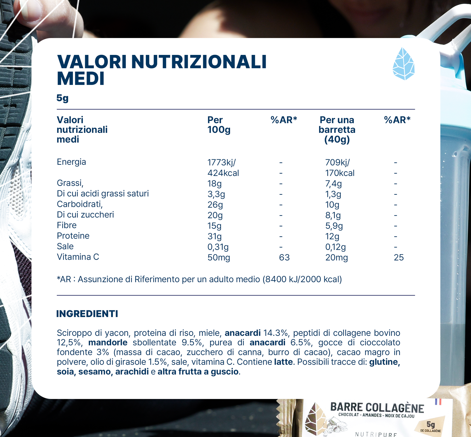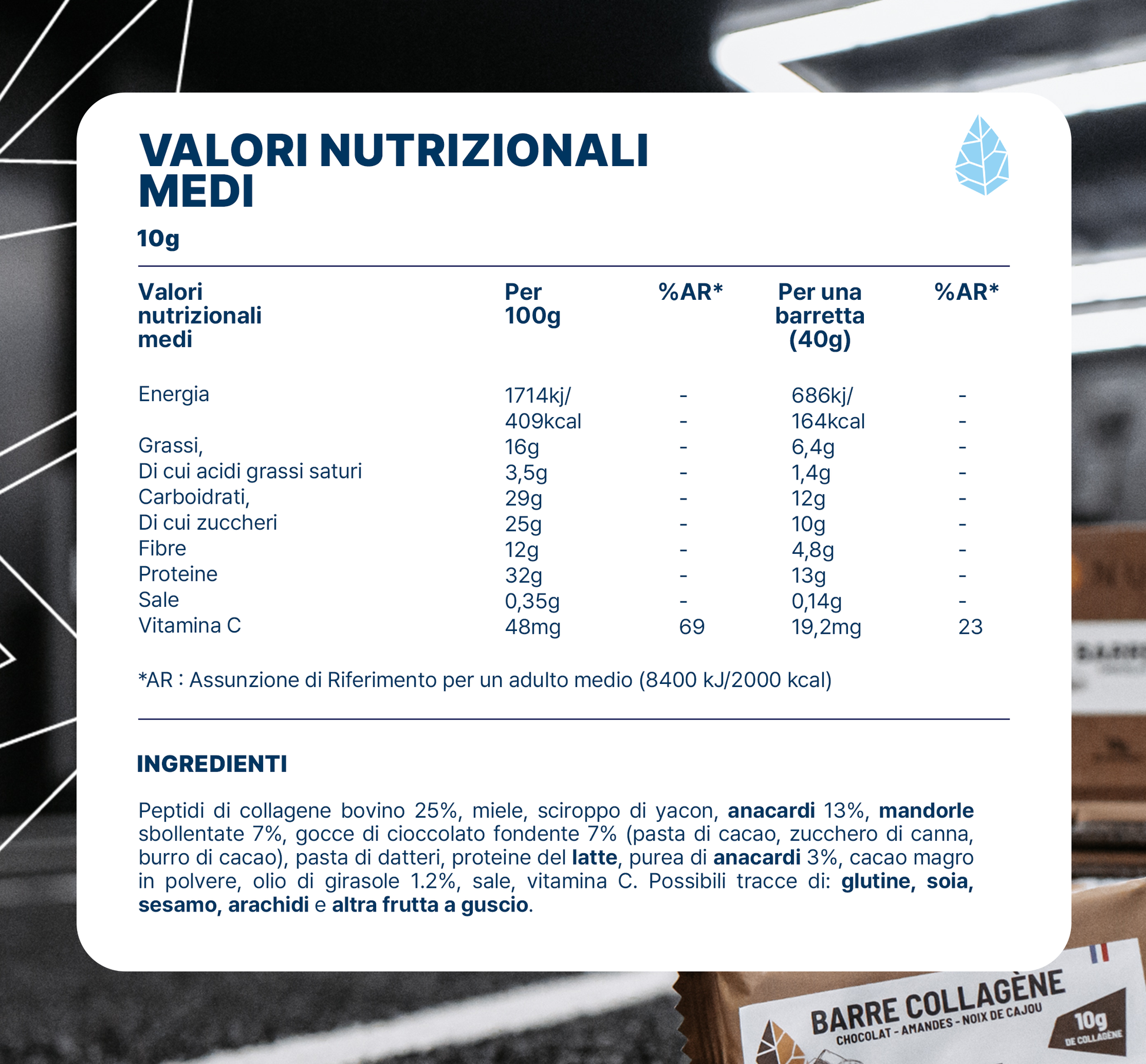 Snack funzionale e gustoso (cioccolato, mandorle, anacardi) che apporta collagene, proteine e fibre. Arricchito con vitamina C per massimizzare la sintesi del collagene.