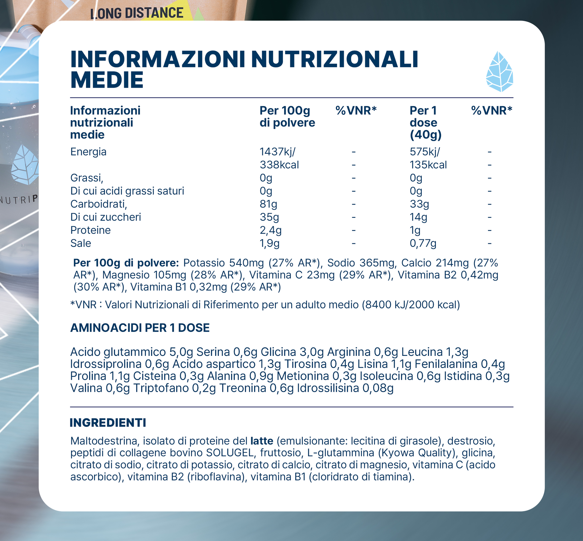 Per dose (55 g): 30 g Carboidrati, 15 g Proteine, 5 g Glutamina, 5 g Collagene Solugel®, 3 g Glicina, 2,5 g BCAA.