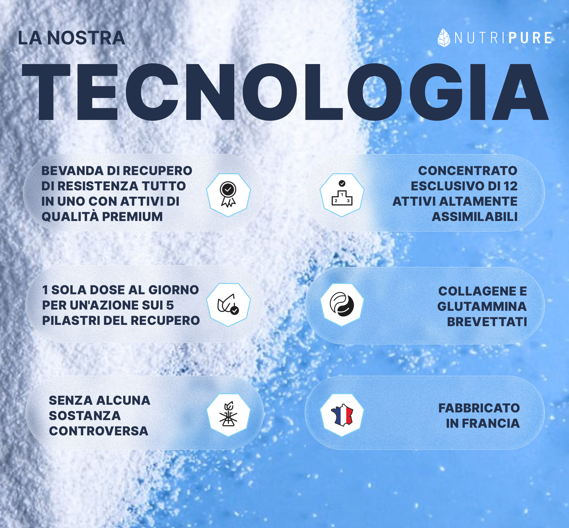 Preparato in polvere per bevanda a base di carboidrati, isolato di proteine del siero del latte, collagene idrolizzato, glutamina, glicina, vitamine e minerali.