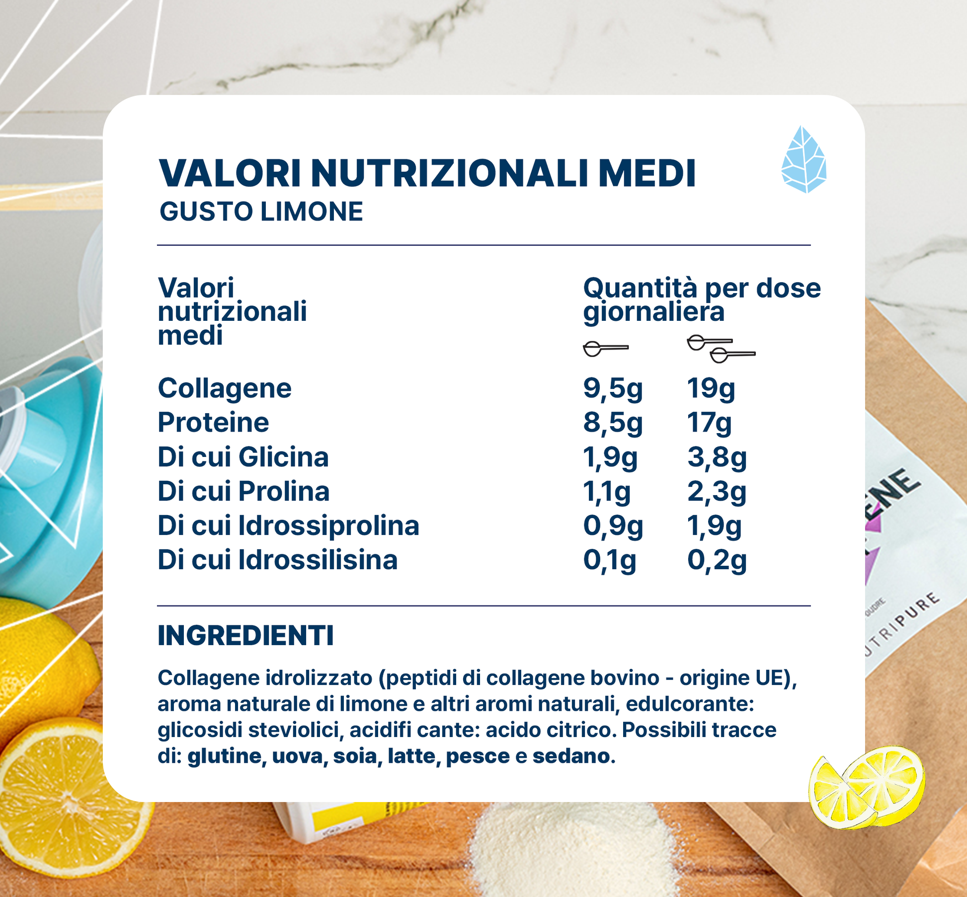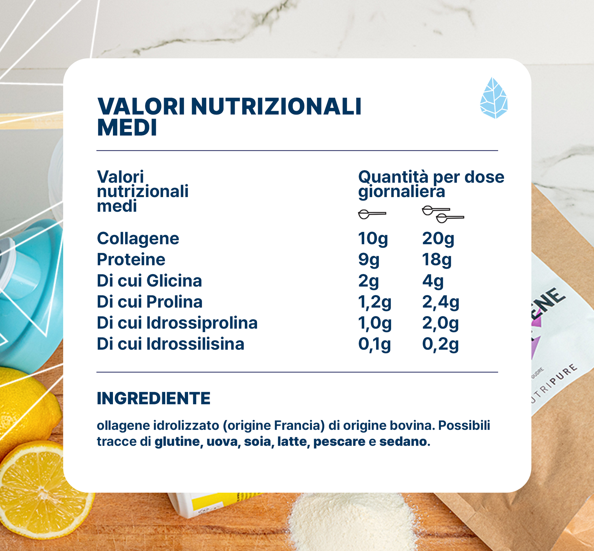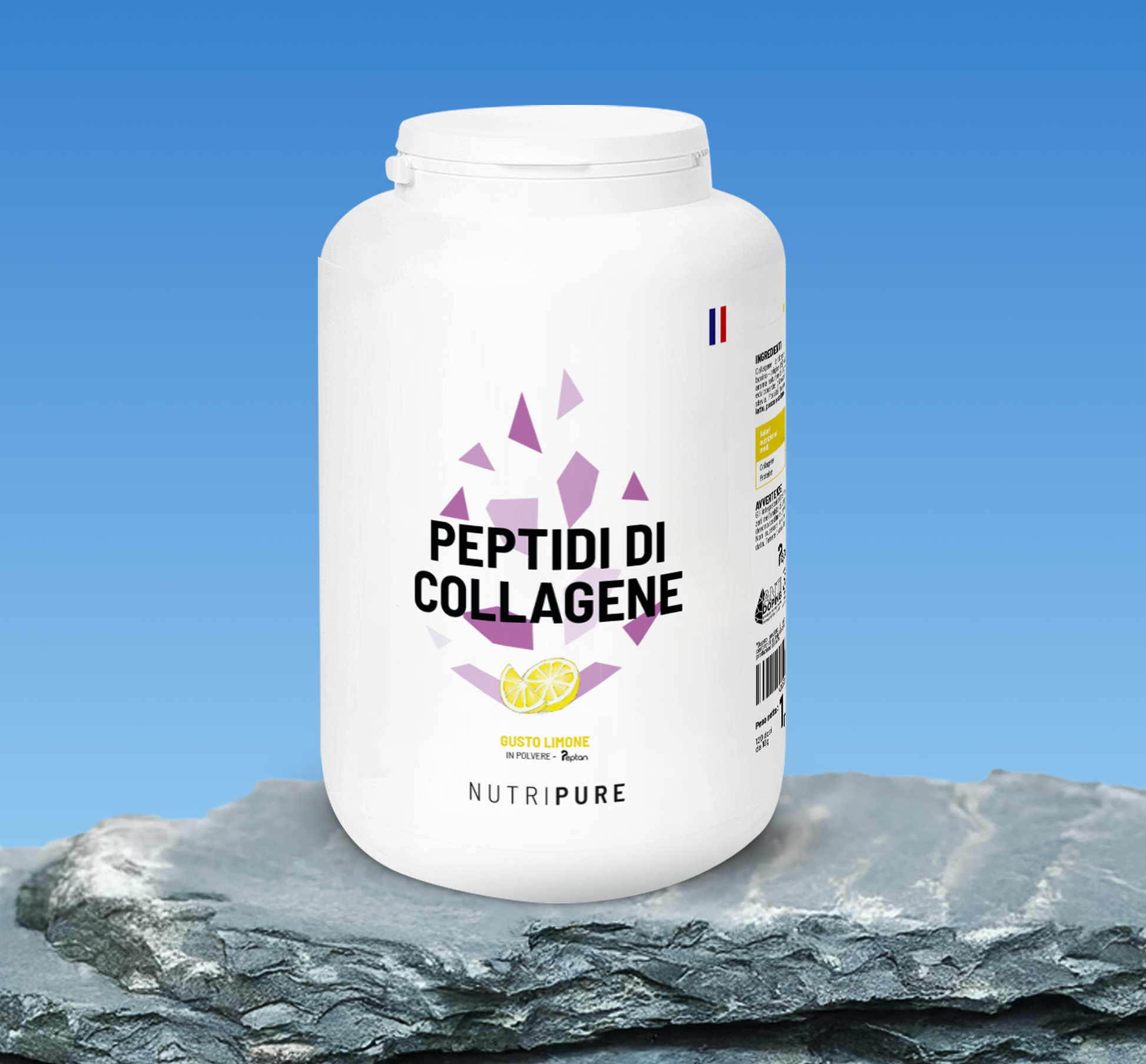 Idrolizzando ulteriormente la gelatina, si ottengono i peptidi di collagene, composti da aminoacidi. I peptidi sono solubili in acqua fredda, sono digeribili e biodisponibili. I peptidi di collagene hanno un peso molecolare compreso tra 5.000 Dalton e 2.000 Dalton. NUTRIPURE ha optato per la forma più qualitativa e assimilabile possibile, scegliendo un peptide di collagene di 2.000 Dalton.