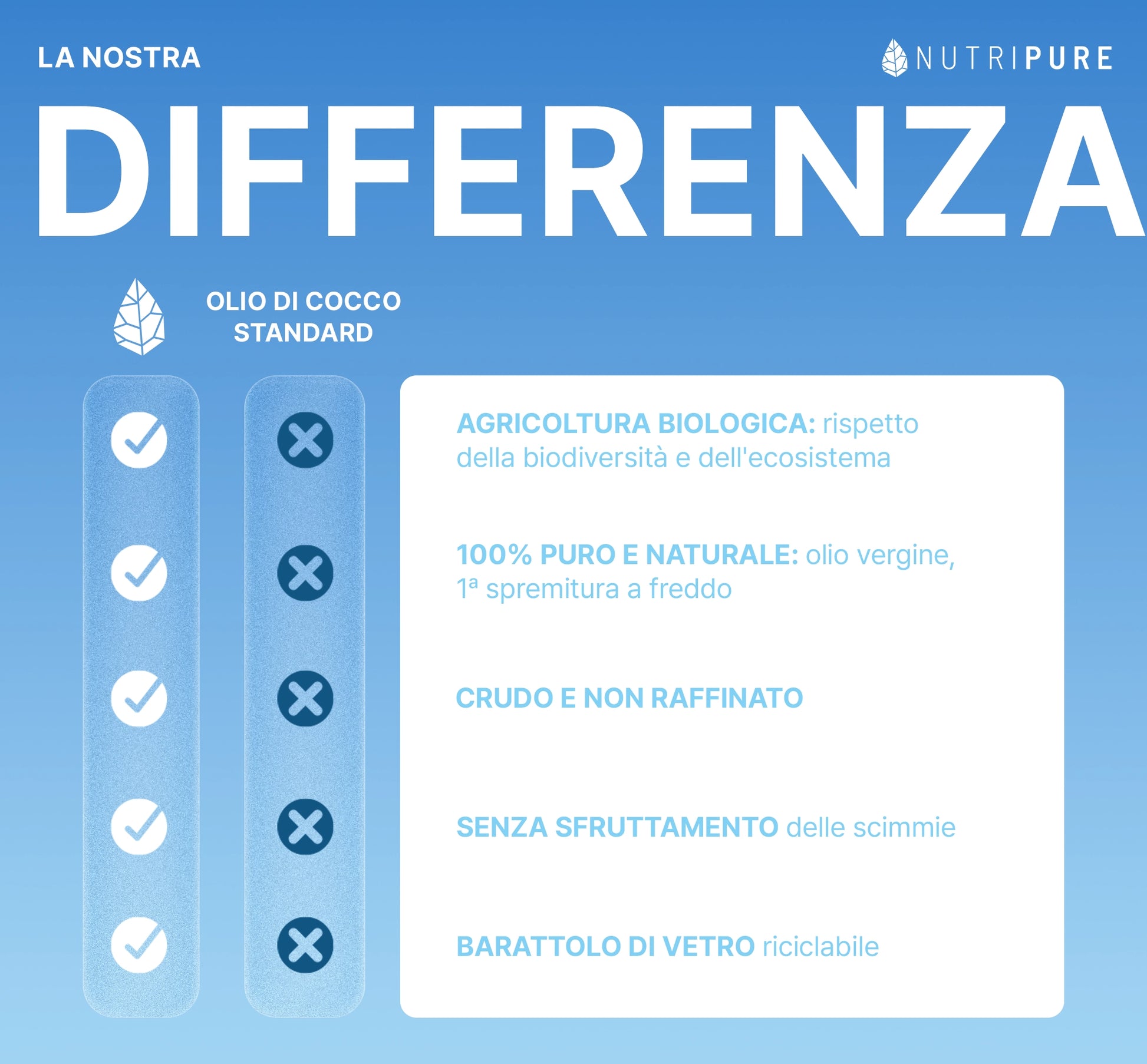 Senza conservanti né coadiuvanti e certificato Ecocert, l’Olio di Cocco Biologico Nutripure è una scelta sana per chi cerca un olio di qualità superiore, rispettoso dell’ambiente e del proprio benessere.
