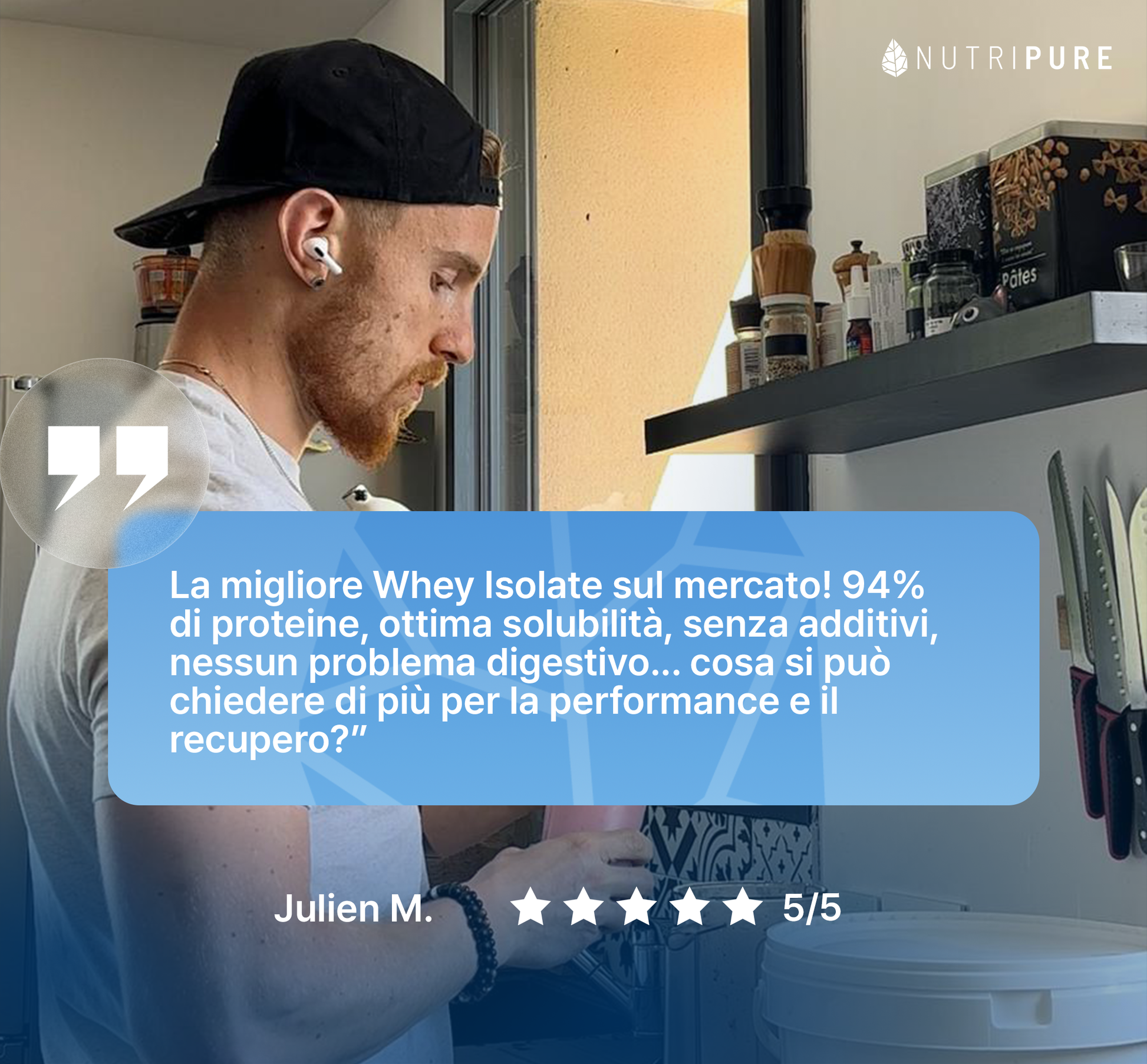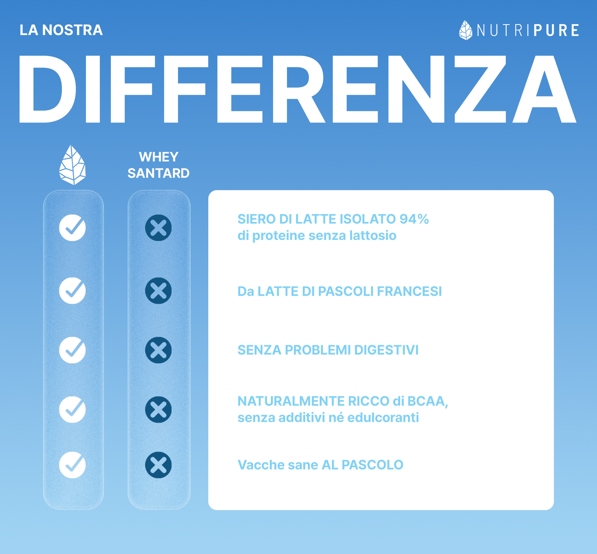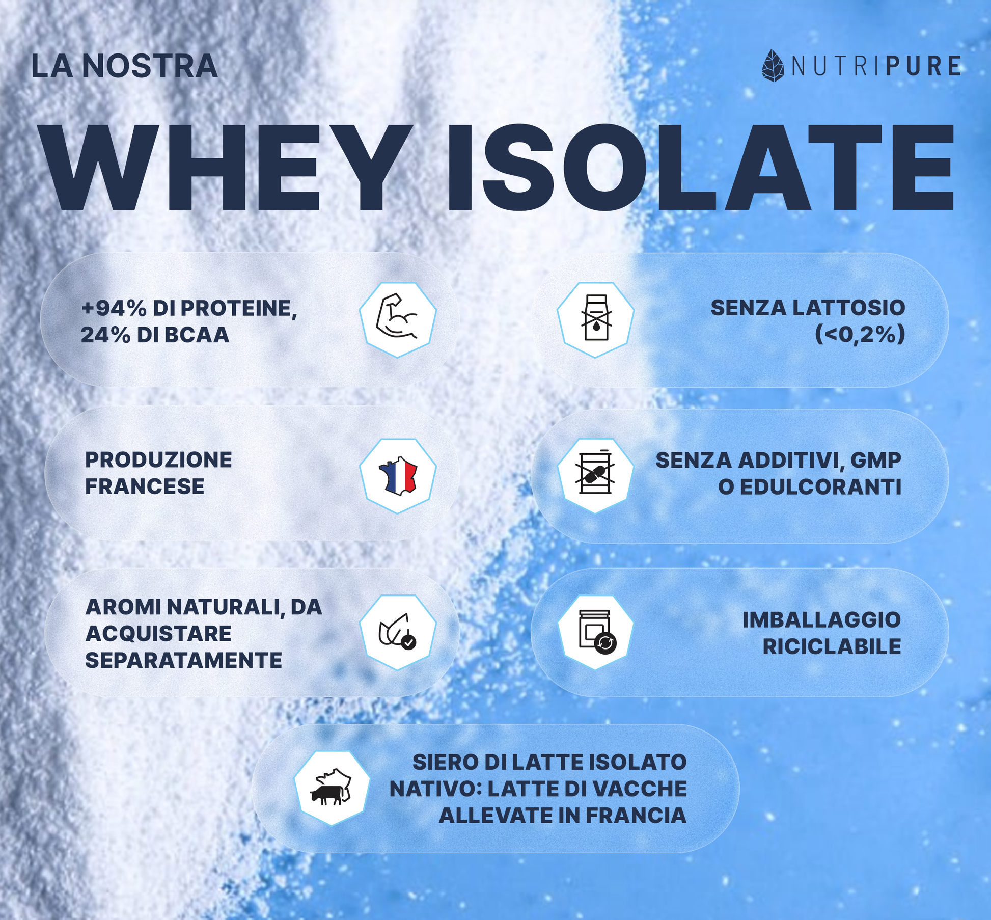 - Un eccellente profilo di aminoacidi essenziali (BCAA e EAA) grazie all'assenza di Glicomacropeptide (GMP), con livelli più alti di triptofano e leucina rispetto a una whey isolate standard.