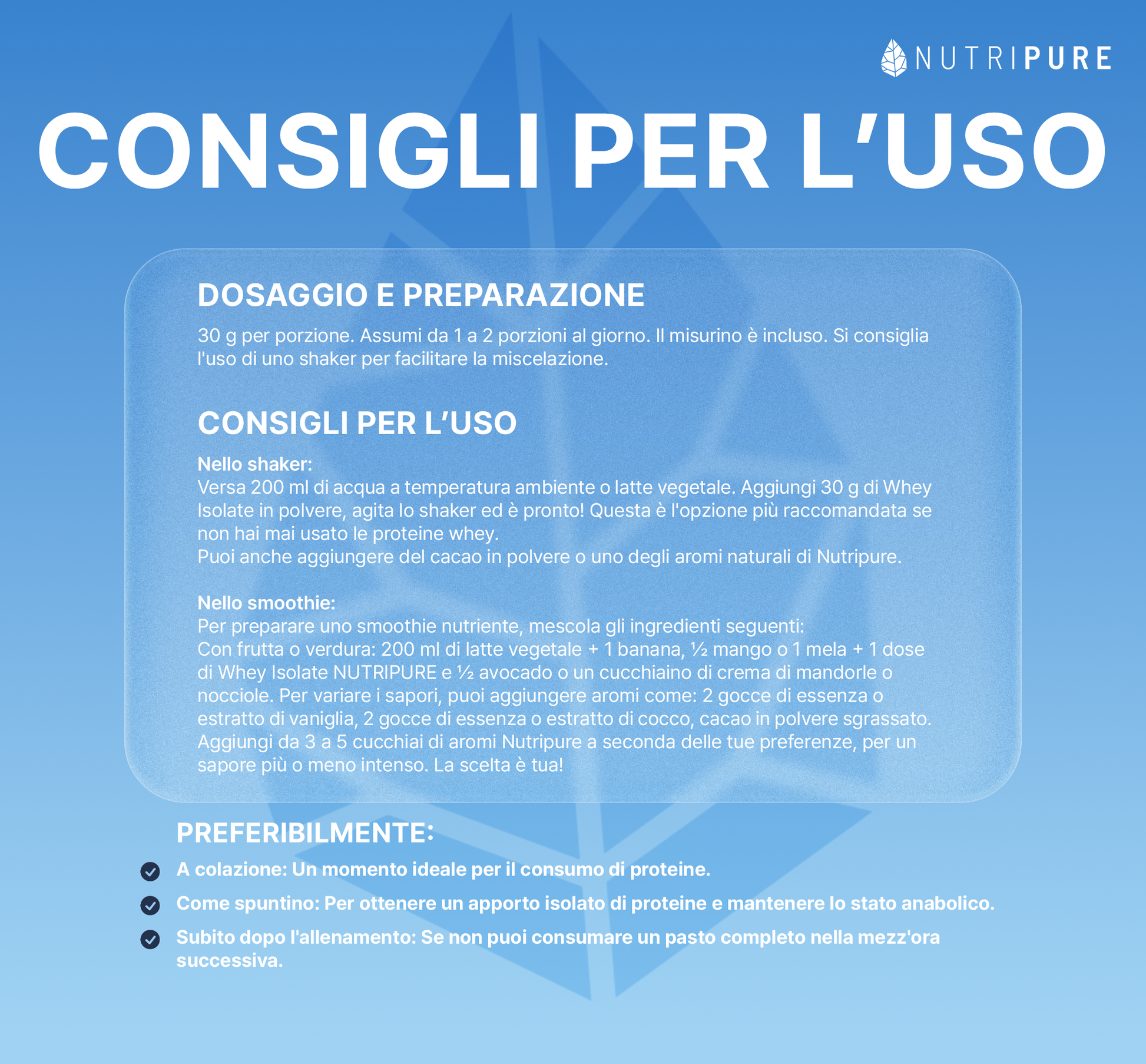 Il suo sapore è neutro, poiché non contiene grassi e non è stata sottoposta a trattamenti termici o chimici che potrebbero alterare le sue proprietà naturali. Abbiamo scelto di offrire il nostro isolato di siero senza aromi, additivi chimici o edulcoranti, i cui effetti nocivi per l'organismo vengono a volte scoperti nel tempo.
