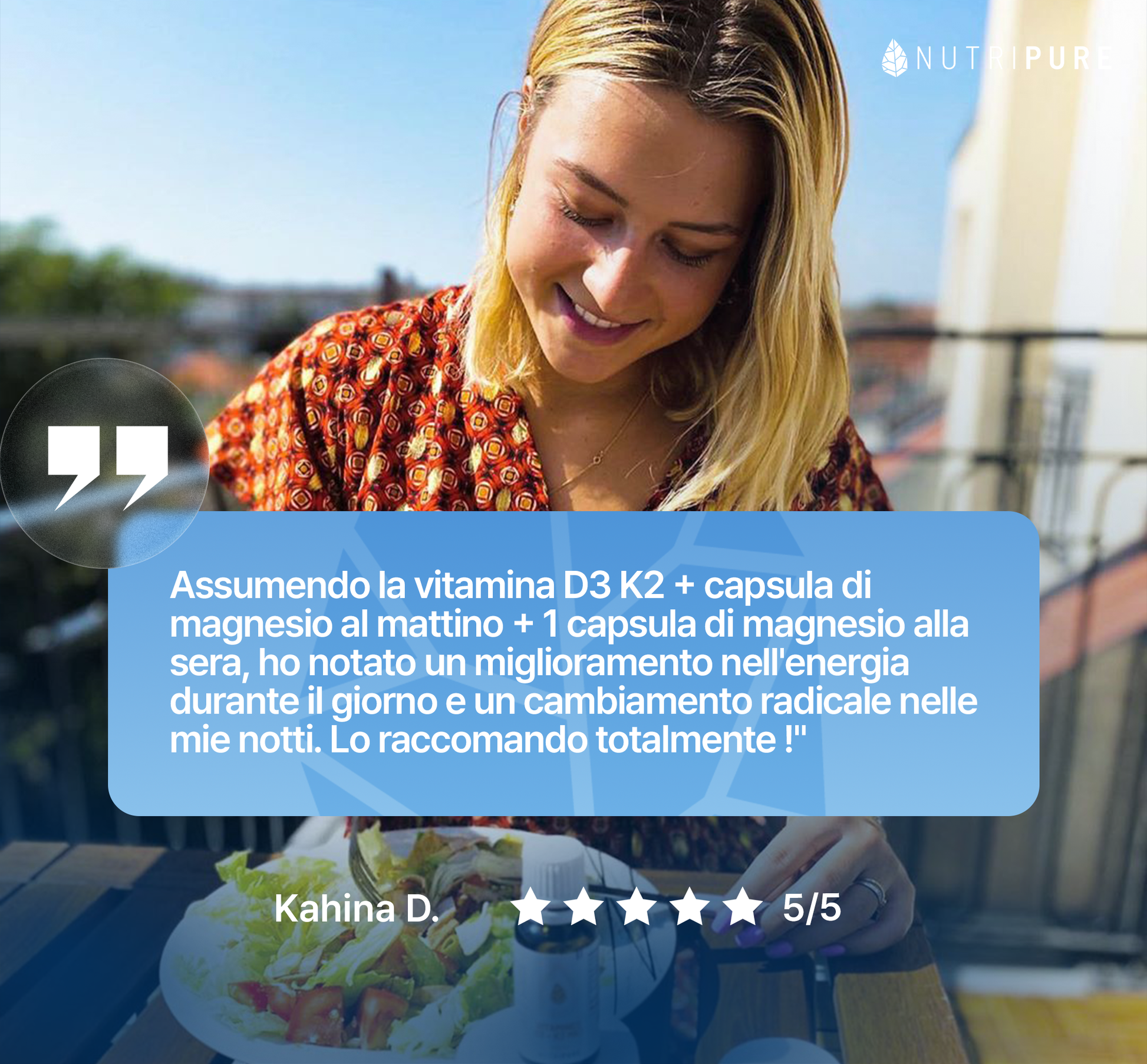 Prendendo la vitamina D3 K2 + capsula di magnesio al mattino + 1 capsula di magnesio la sera, ho notato un miglioramento dell'energia durante il giorno e un cambiamento radicale nelle mie notti. Lo raccomando totalmente!