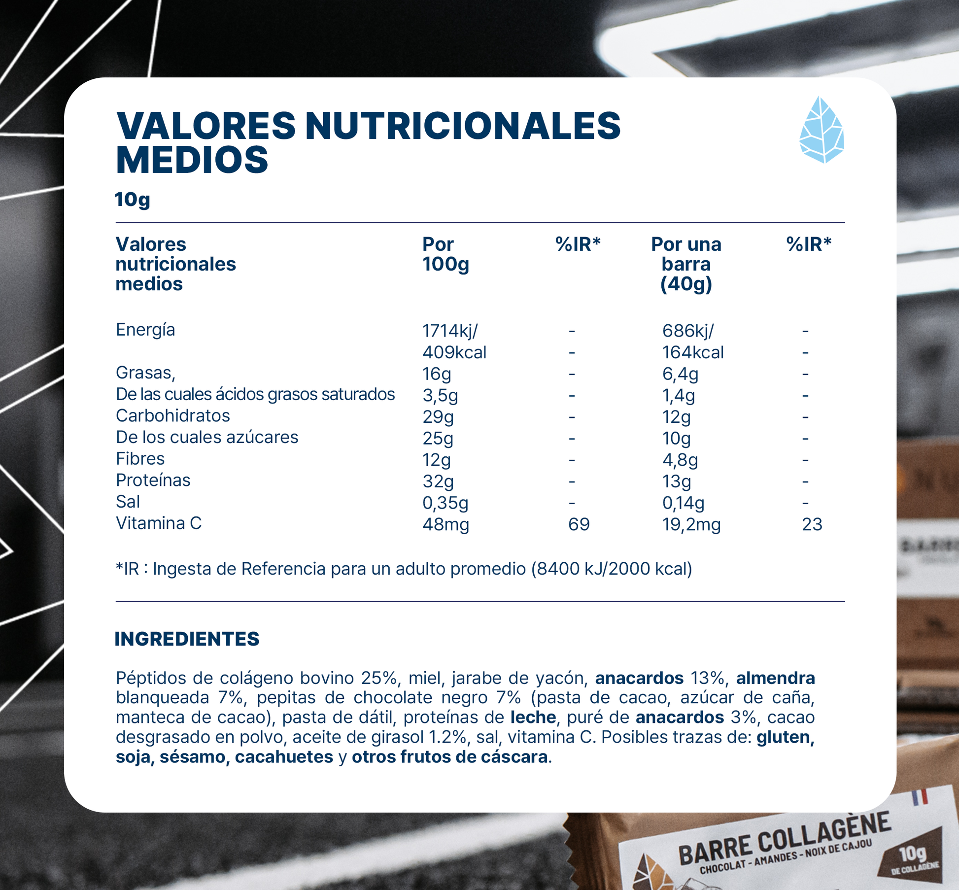 Barrita 10 g: Péptidos de colágeno bovino 25 %, miel, sirope de yacón, anacardos 13 %, almendra blanqueada 7 %, pepitas de chocolate negro 7 % (pasta de cacao, azúcar de caña, manteca de cacao), pasta de dátil, proteínas de leche, puré de anacardos 3 %, cacao magro en polvo, aceite de girasol 1,2 %, sal, vitamina C.