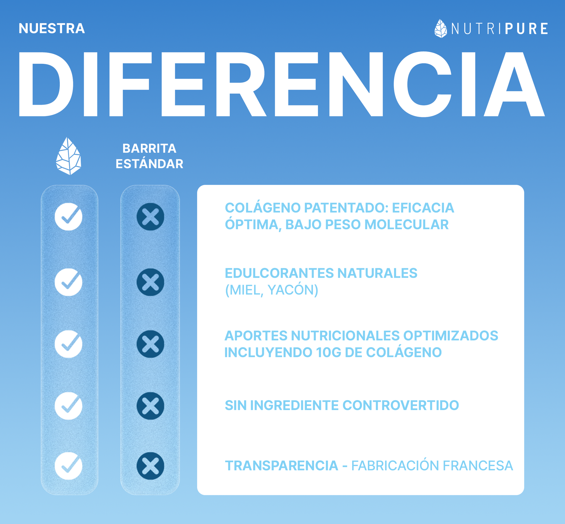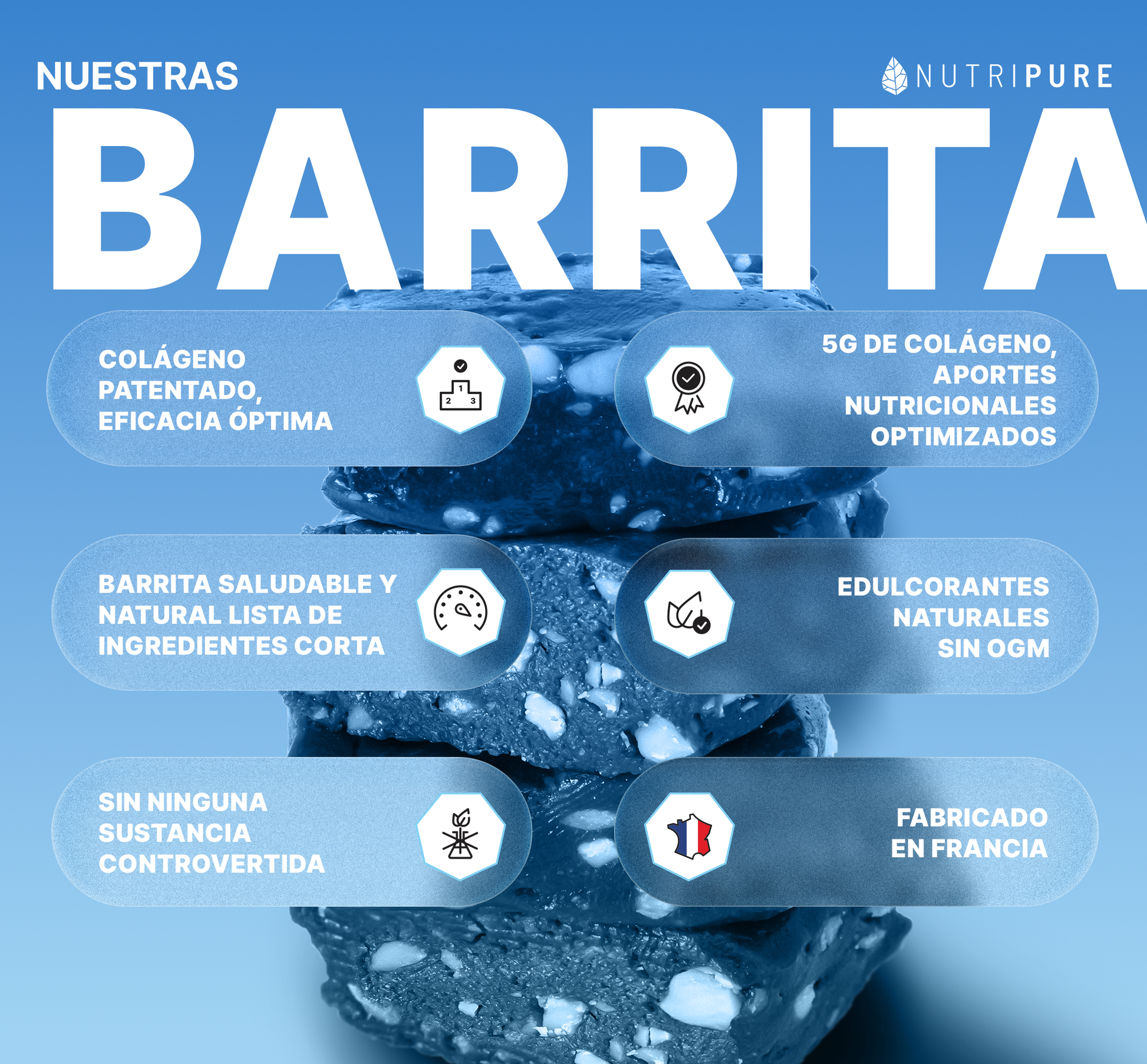 Por barrita: 12 g proteínas (de los cuales 5 g o 10 g son colágeno), 5 g de fibra, menos de 170 kcal.