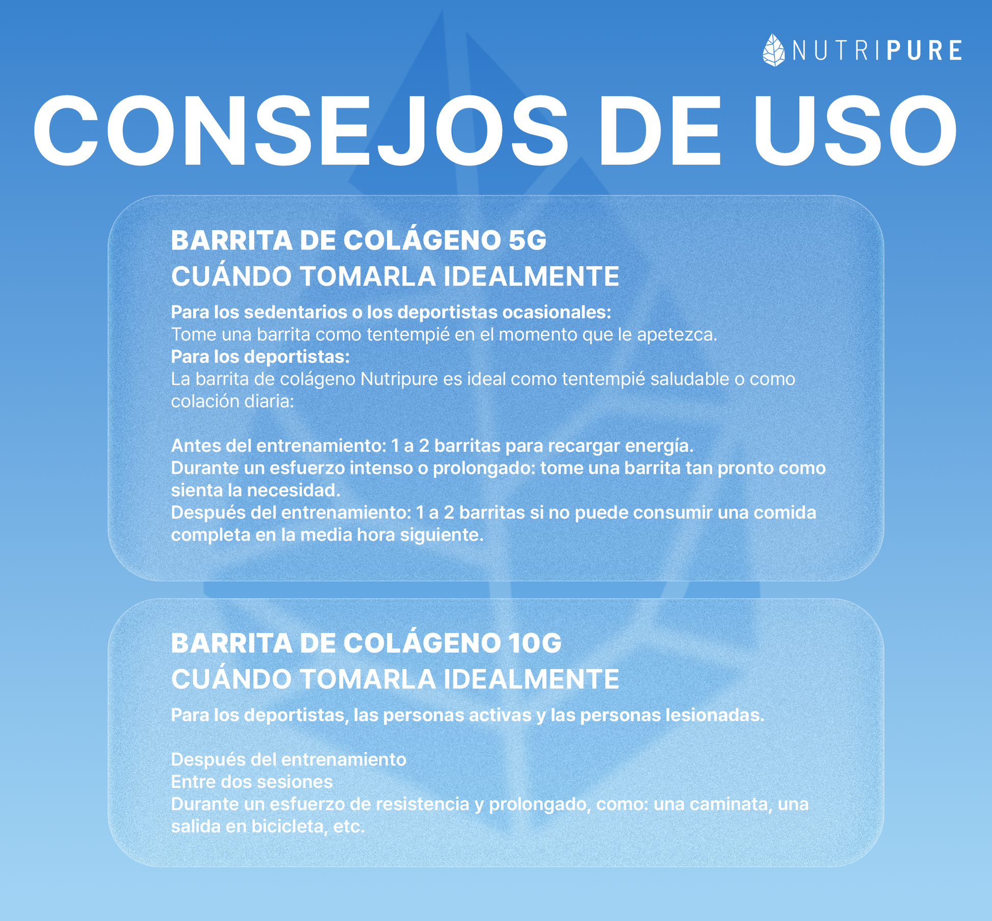 🕑 Posología Disponible en dos dosificaciones: 5 g o 10 g de colágeno patentado (2000 Daltons) por barrita.
