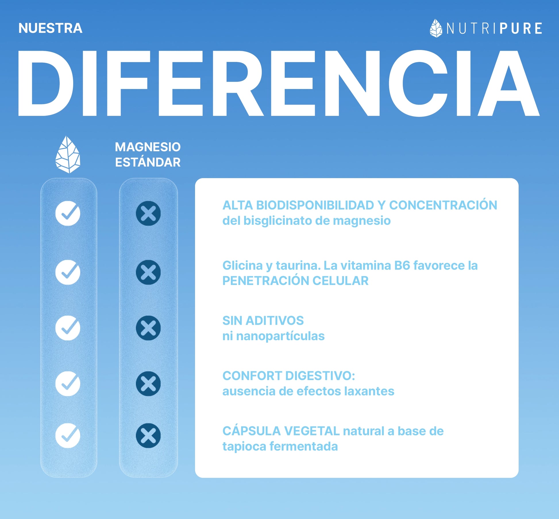 Mientras que el citrato de magnesio puede tener un efecto laxante en algunas personas, nuestro bisglicinato es conocido por ser muy bien tolerado. Nuestra fórmula se centra en la sinergia del magnesio quelado con taurina y B6 para la relajación y energía celular, a diferencia de otros suplementos que usan triptófano o GABA, que actúan de forma diferente sobre el sistema nervioso.