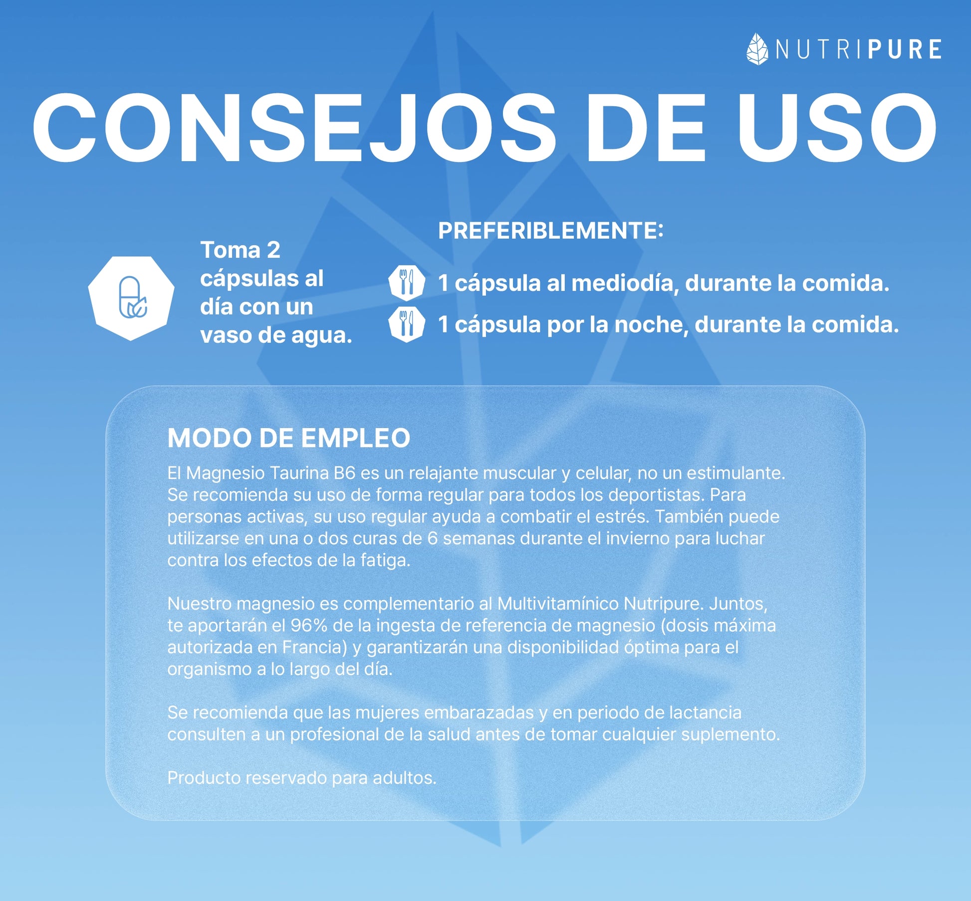 El Magnesio Taurina B6 NUTRIPURE es un relajante muscular y celular; no es un estimulante, por lo que no afecta al sueño diurno. Se recomienda su uso regular a todos los deportistas. En personas activas, puede utilizarse regularmente para combatir el estrés o en uno o dos tratamientos invernales de 6 semanas para combatir los efectos de la fatiga.