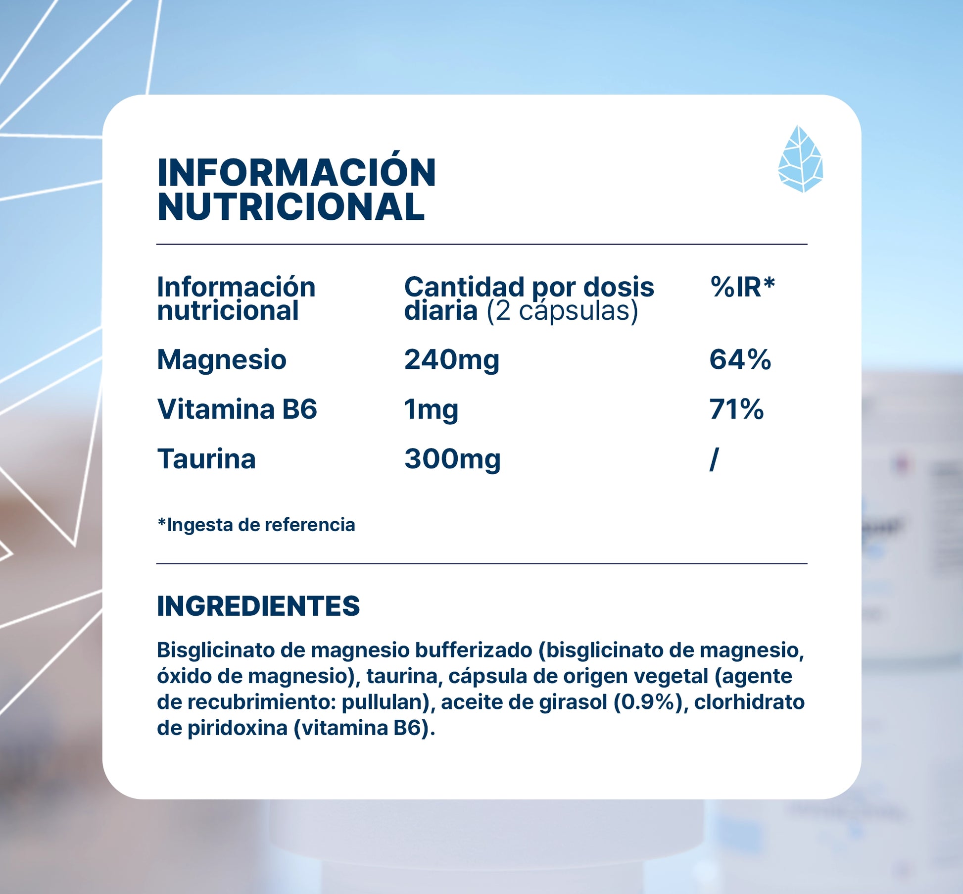 Ingredientes: Bisglicinato de magnesio tamponado (bisglicinato de magnesio, óxido de magnesio), taurina, cápsula vegetal (agente de recubrimiento: pullulan), harina de coco (Cocos nucifera L.), clorhidrato de piridoxina (vitamina B6).
