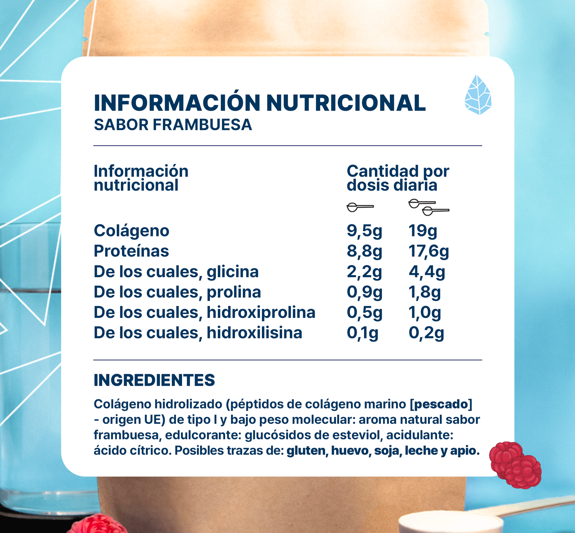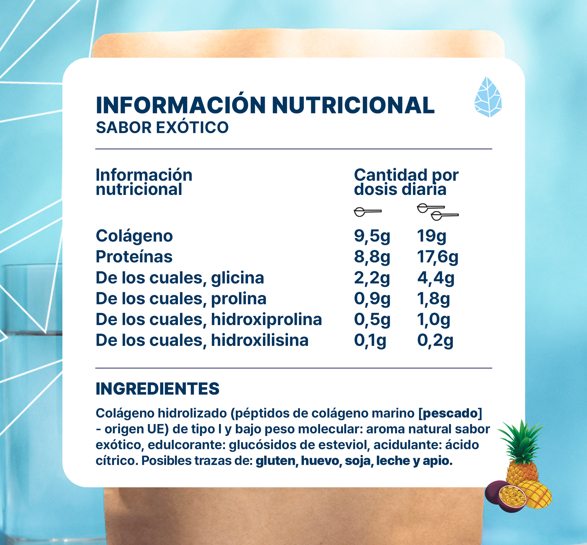 Colágeno hidrolizado (péptidos de colágeno marino (pescado) - origen UE) de tipo I y III de bajo peso molecular.