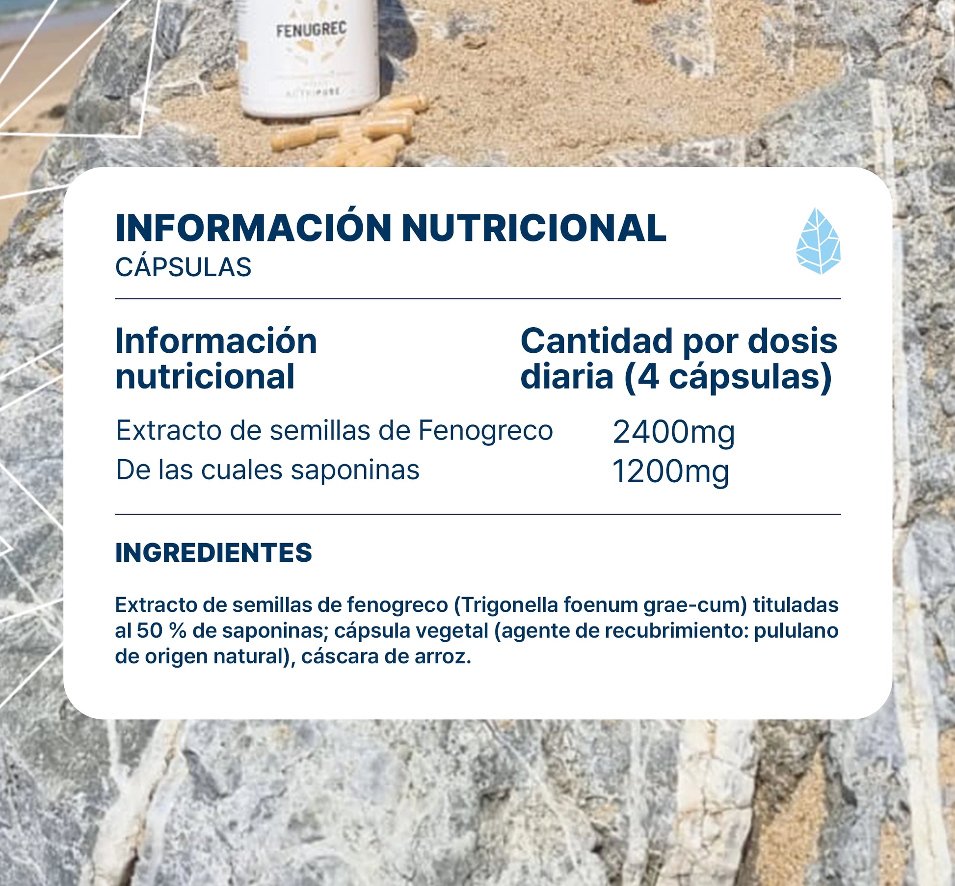 Extracto de semillas de Fenogreco (Trigonella foenum graecum) tituladas al 50% de saponinas, cápsula vegetal natural (agente de recubrimiento: pululano), agente de carga: goma de acacia, aceite de girasol (0,1%).