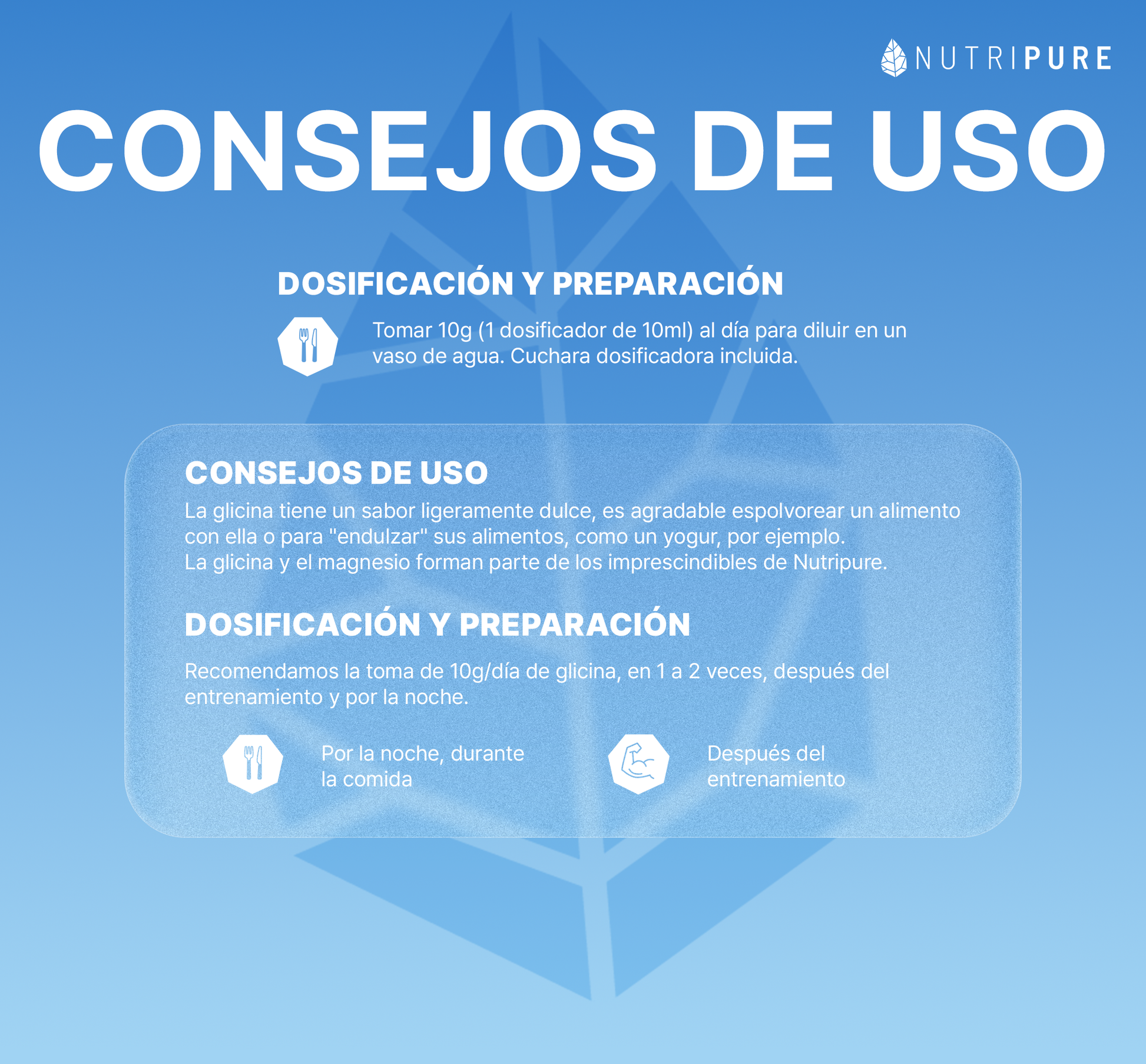 Con una posología media de 10 g al día, se integra perfectamente en la alimentación de las personas deportistas o sedentarias. En forma de polvo, la glicina es simple y agradable de consumir gracias a su sabor dulce.