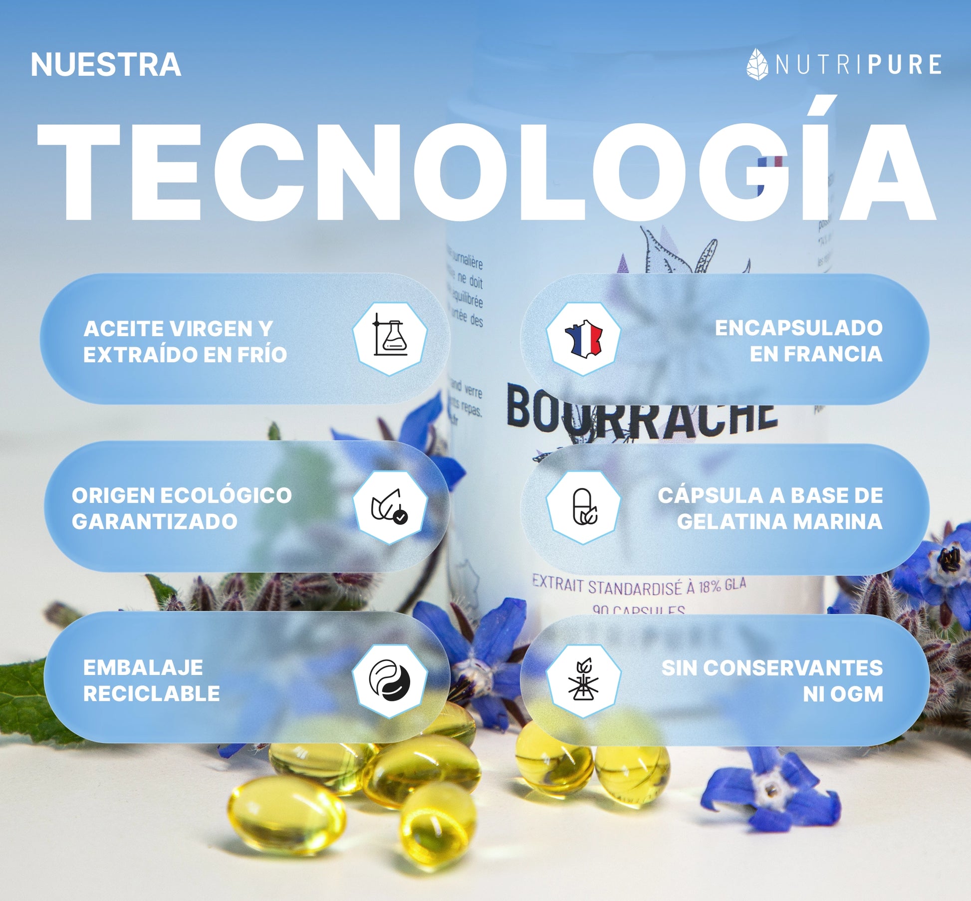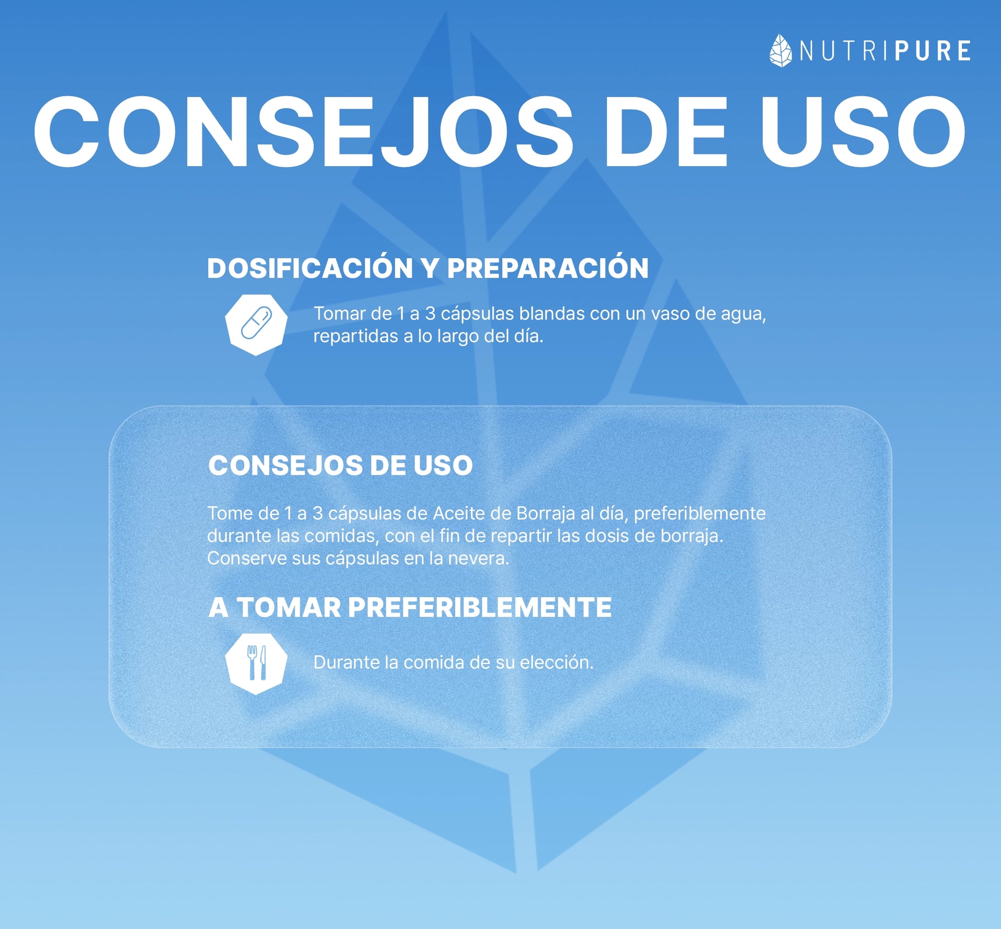 🕑 Posología : 1500 mg de Aceite de Borraja (270 mg GLA) por dosis diaria (3 cápsulas).