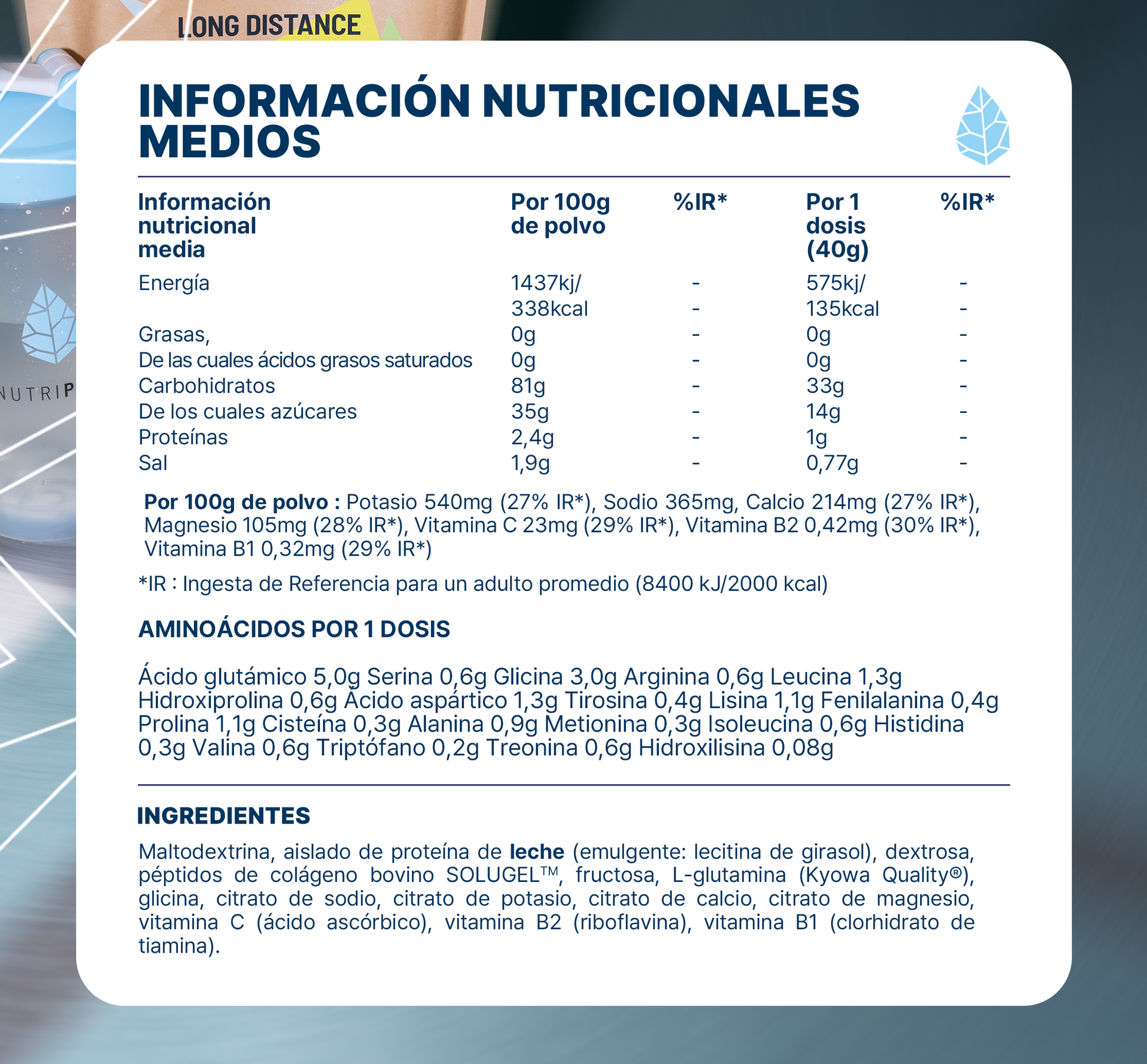 Long Distance Recovery ha sido formulado con una lista de ingredientes estudiados: carbohidratos, proteínas (aislado de whey nativa) enriquecidas con aminoácidos específicos (glutamina, glicina), péptidos de colágeno (Solugel®), electrolitos y vitaminas (C, B1, B2).
