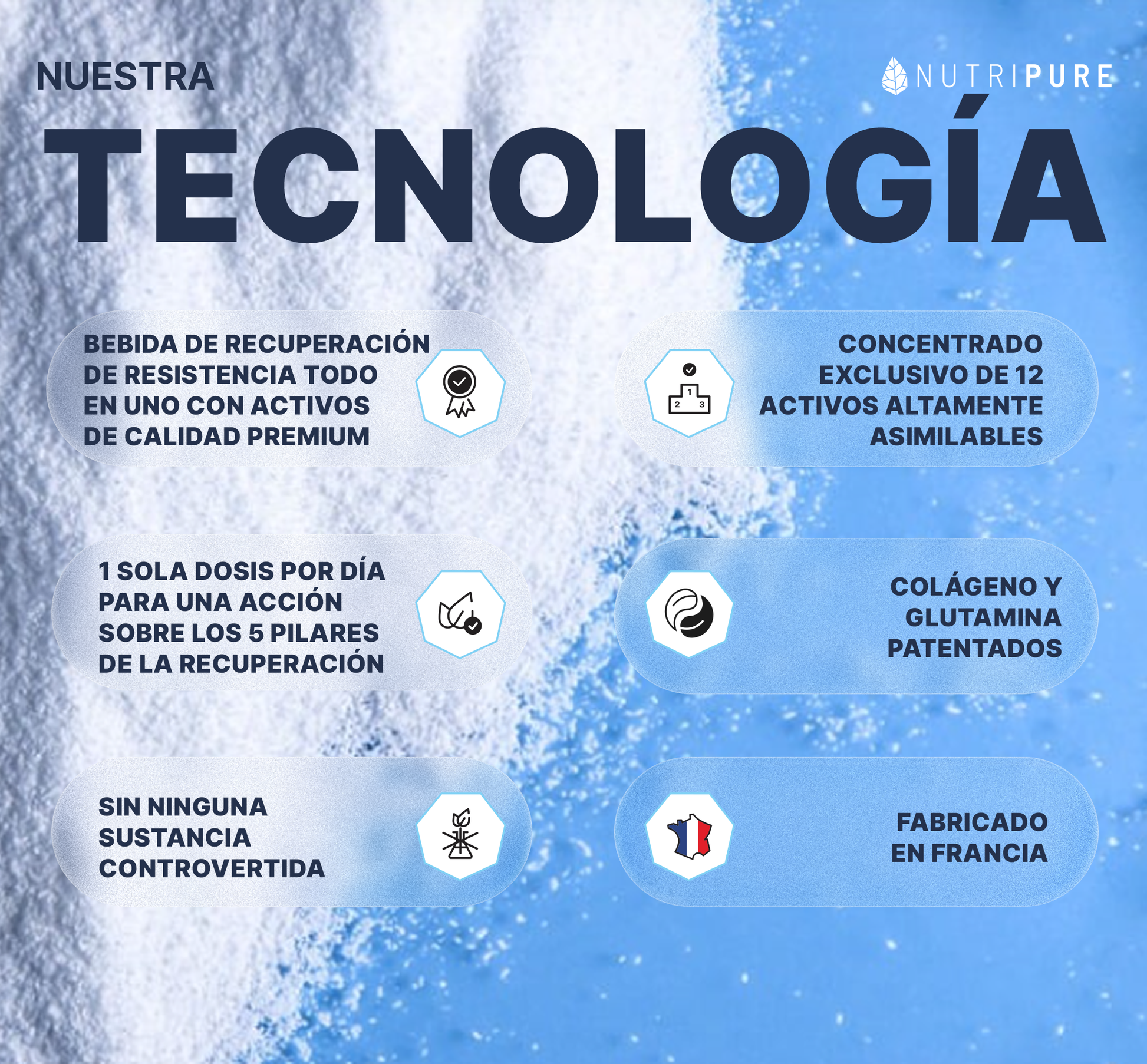 Fórmula completa con 12 activos: carbohidratos, proteínas (Whey Isolate Nativo), colágeno (patentado tipo I), glutamina, glicina, electrolitos y vitaminas.