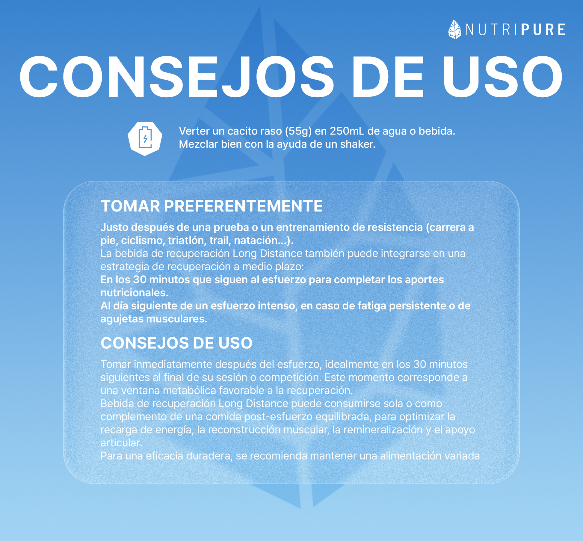 Puede consumirse sola o junto con una comida post-esfuerzo equilibrada. También puede integrarse al día siguiente de un esfuerzo intenso, en caso de fatiga persistente o agujetas musculares. Ideal tras largas sesiones de resistencia (carrera, ciclismo, natación, trail, triatlón…).