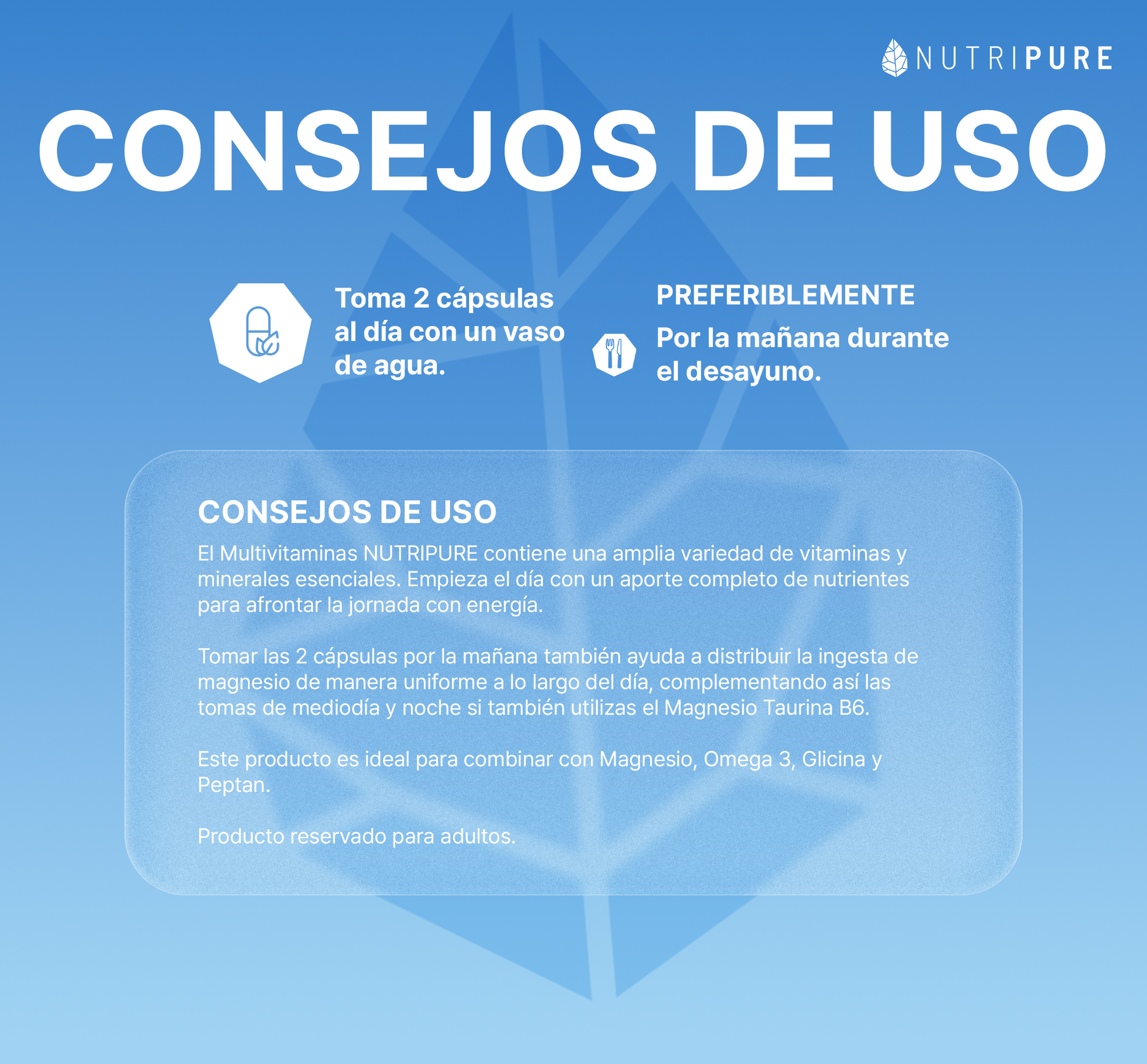 El multivitamínico NUTRIPURE contiene varias vitaminas y minerales. Cuando comience un nuevo día, empiece también por recargar vitaminas.