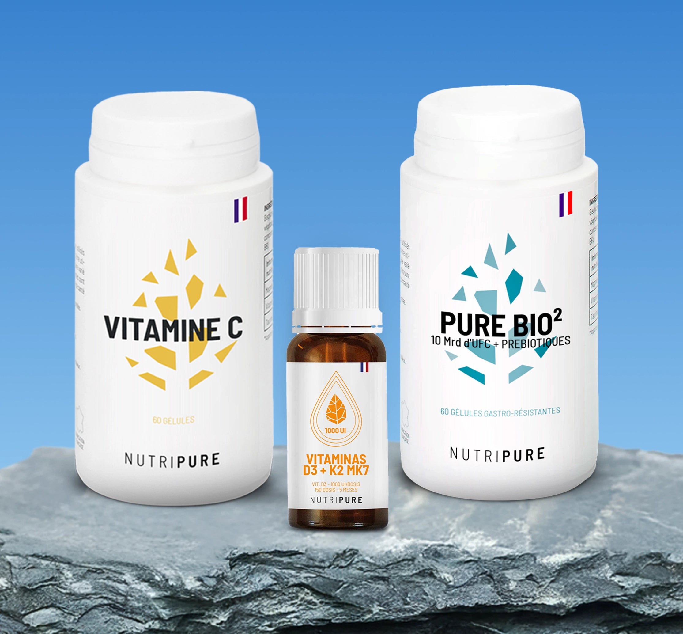 🕑 Posología : Vitamina C (1 cápsula/día) + Pure Bio² (2 cápsulas/día) + Vitamina D3 K2-MK7 (3 gotas/día).