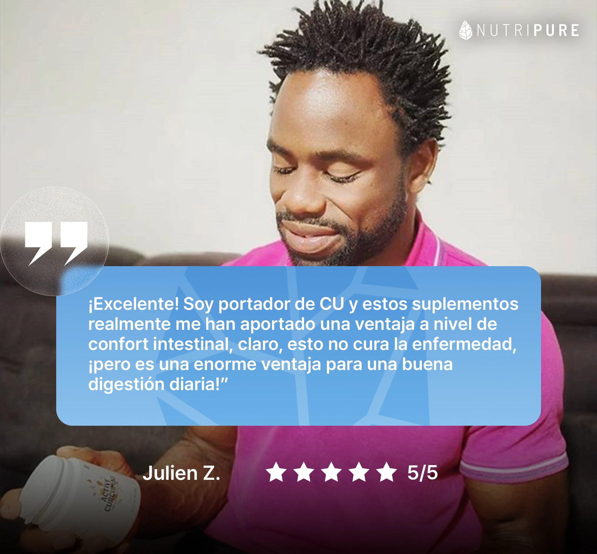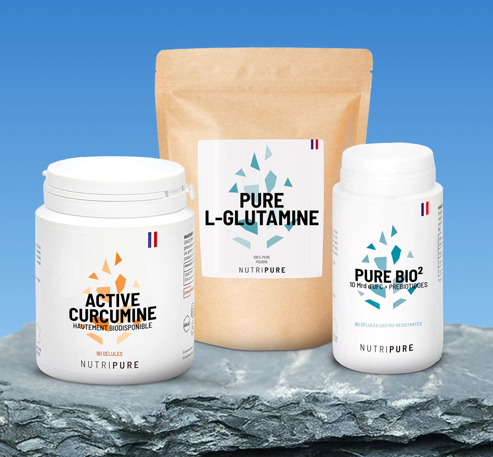 Asociación completa para el confort intestinal: restaura la microbiota (Pure Bio²), nutre la pared intestinal (Glutamina, el aminoácido preferido del intestino) y ayuda a regular la inflamación digestiva (Curcumina).