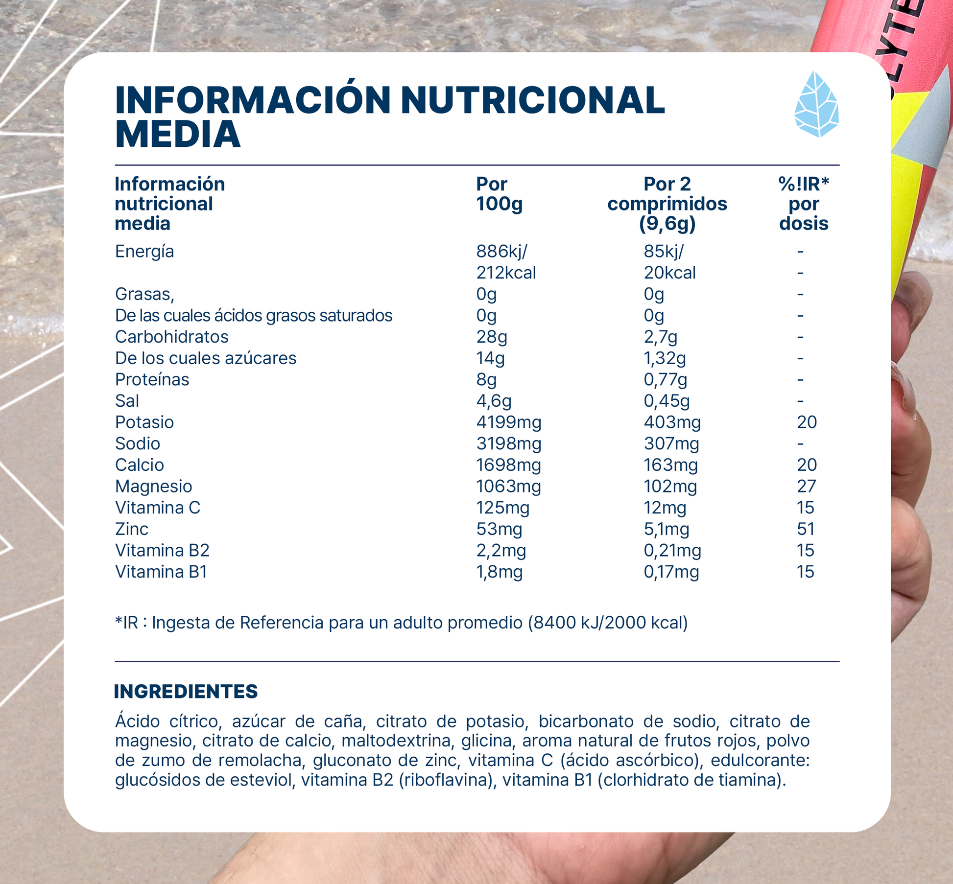 Cada pastilla efervescente aporta 5 electrolitos clave y 3 vitaminas para una hidratación optimizada y un apoyo metabólico.