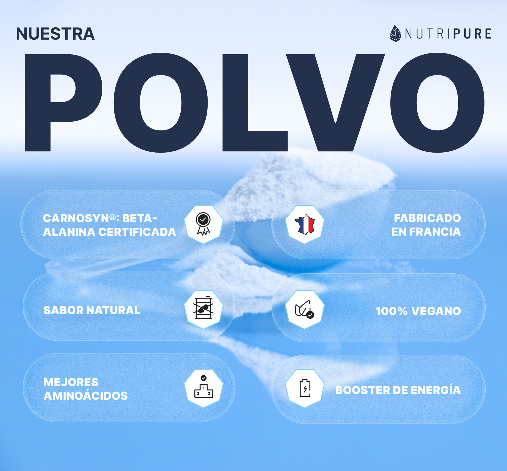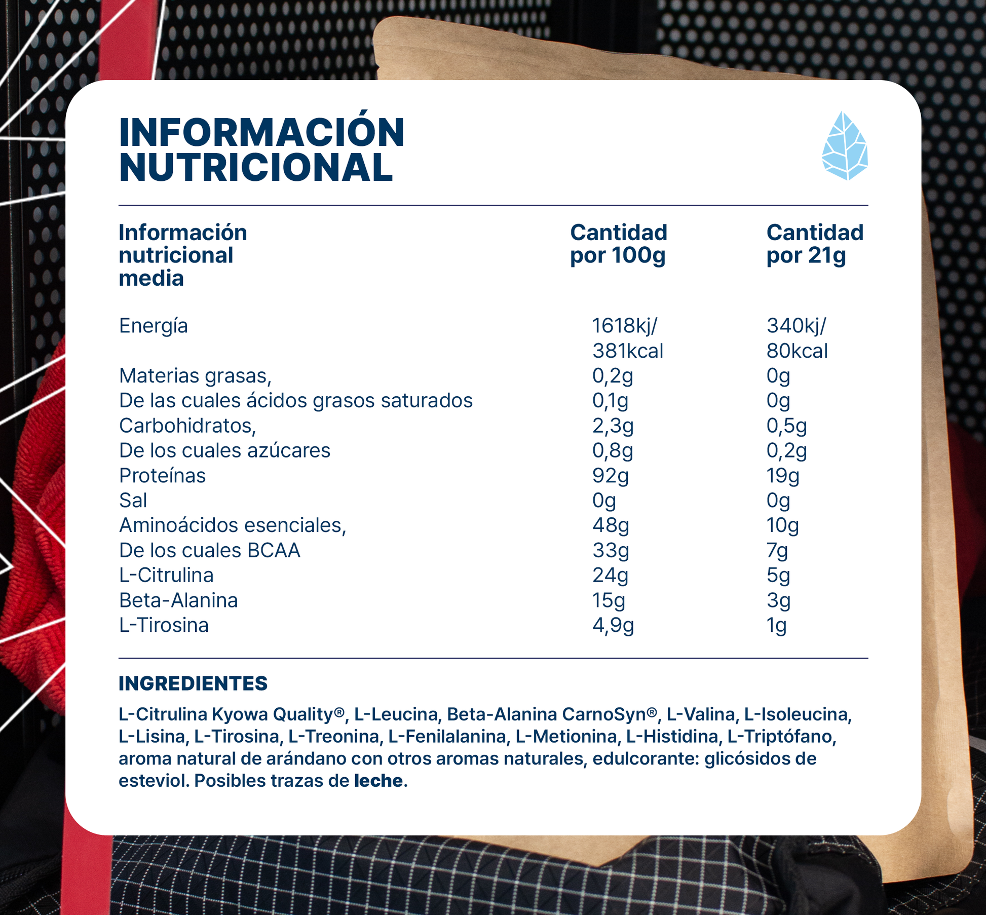 - Ingredientes patentados de primera elección: utilizamos activos de calidad reconocida como la beta-alanina CarnoSyn® y la L-citrulina Kyowa®, procedentes de procesos de fabricación patentados que garantizan una pureza y una trazabilidad excepcionales.