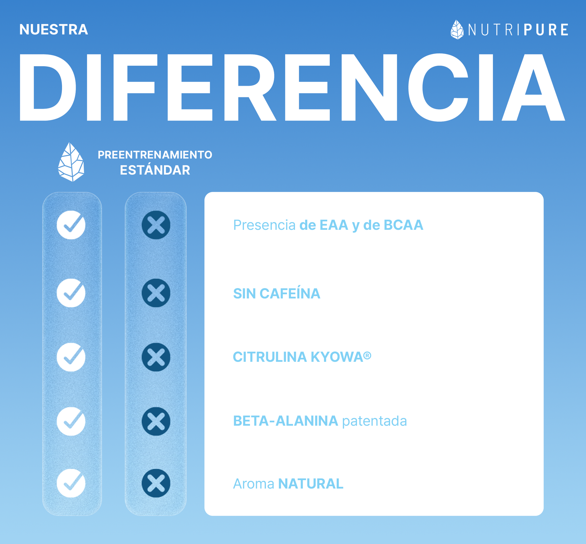El mercado de los pre-entreno está saturado de productos con sobredosis de cafeína y otros estimulantes. Nuestra visión es radicalmente diferente. Hemos formulado voluntariamente el Pure Workout sin cafeína por una razón simple: creemos en el soporte nutricional, no en la estimulación artificial.