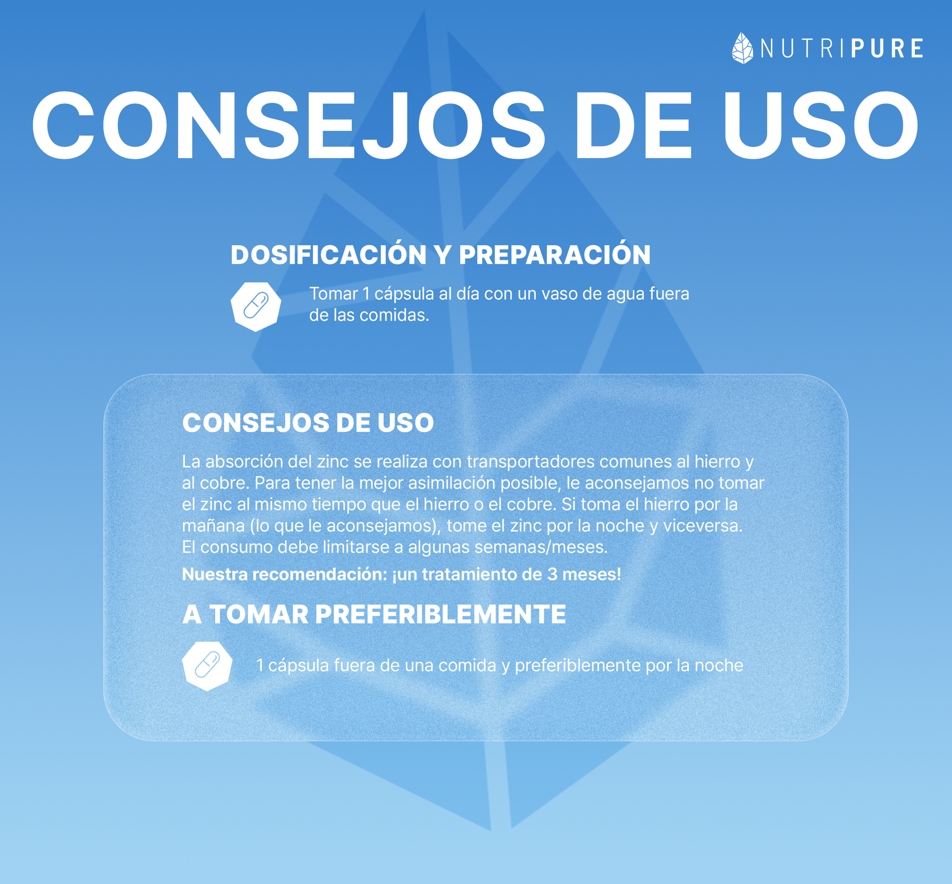 El suplemento alimenticio de zinc en cápsula ha sido formulado para responder a las necesidades de: veganos/vegetarianos, mujeres embarazadas/lactantes, personas mayores, personas con sistema inmunitario débil o piel con tendencia acneica y los deportistas.