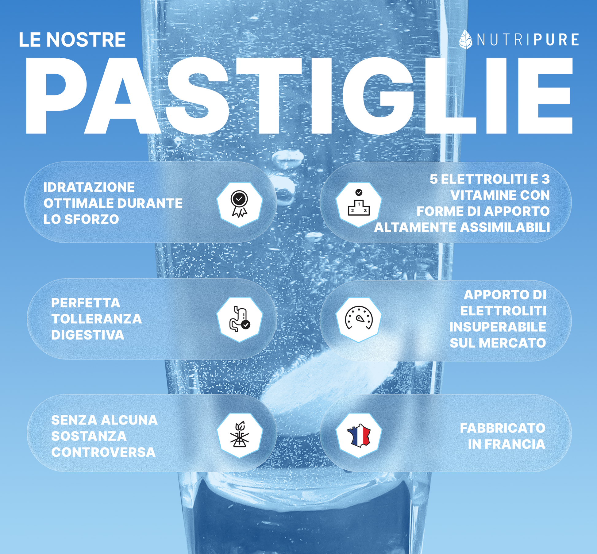 La precisione del dosaggio è fondamentale per l'efficacia di un apporto di elettroliti. Ogni pastiglia idratazione Nutripure contiene una quantità studiata di $5$ minerali e $3$ vitamine, mirando all'equilibrio ottimale per sostenere l'idratazione e le funzioni del tuo corpo.