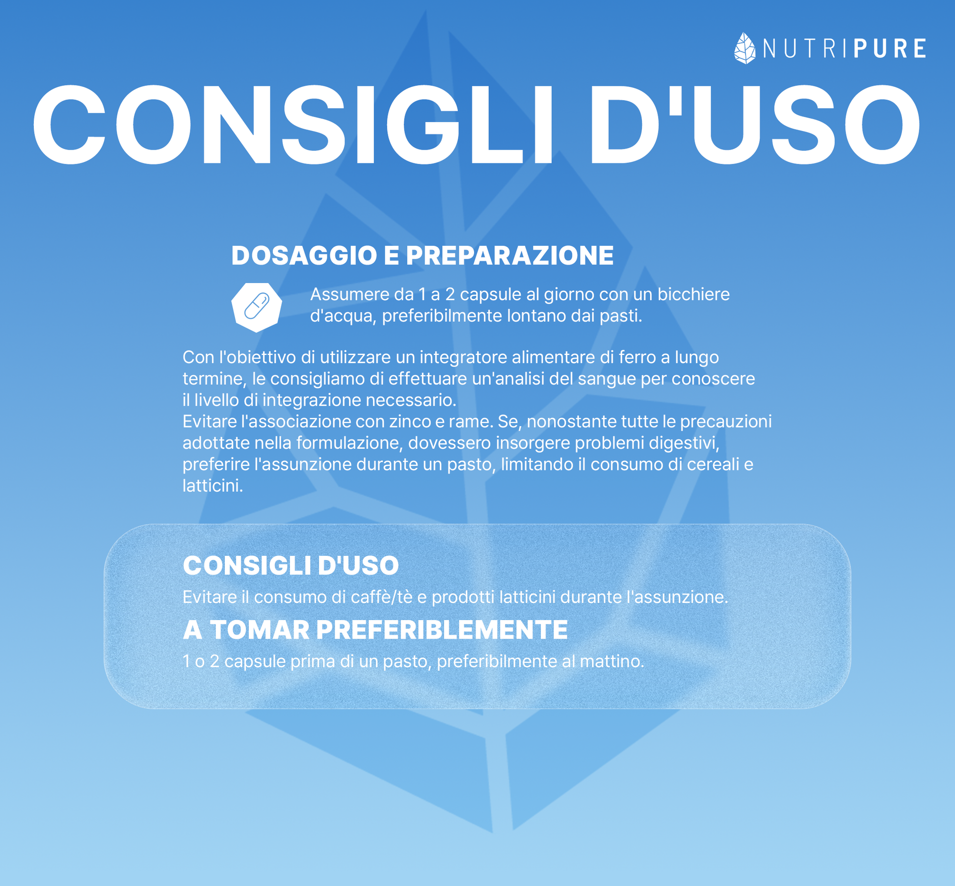 Per questo Nutripure ha scelto un bisglicinato di ferro di alta qualità, il cui dosaggio è modulabile a 1–2 capsule al giorno, evitando il rischio di sovradosaggio.
