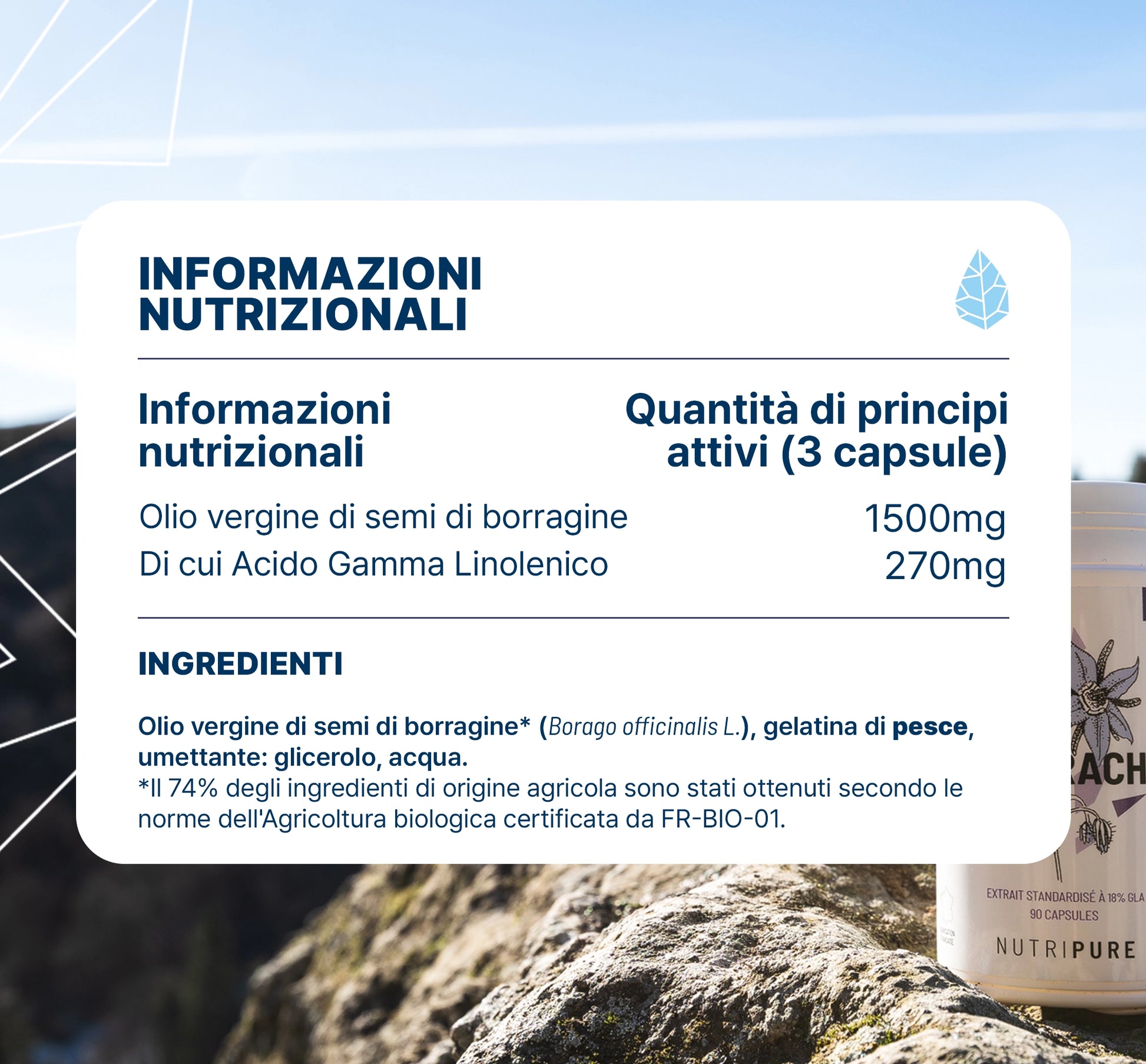 La borragine è una piccola pianta dai fiori viola e blu. I suoi semi contengono in particolare acidi grassi essenziali polinsaturi come l'Acido Gamma-Linolenico (GLA). Sono definiti essenziali perché il nostro corpo non è in grado di sintetizzarli.