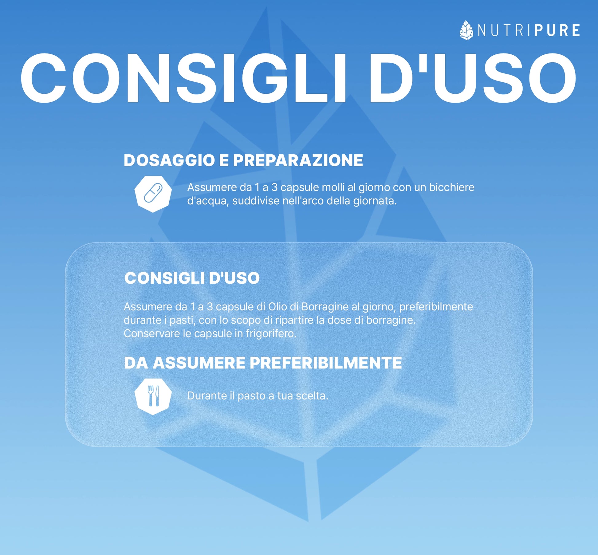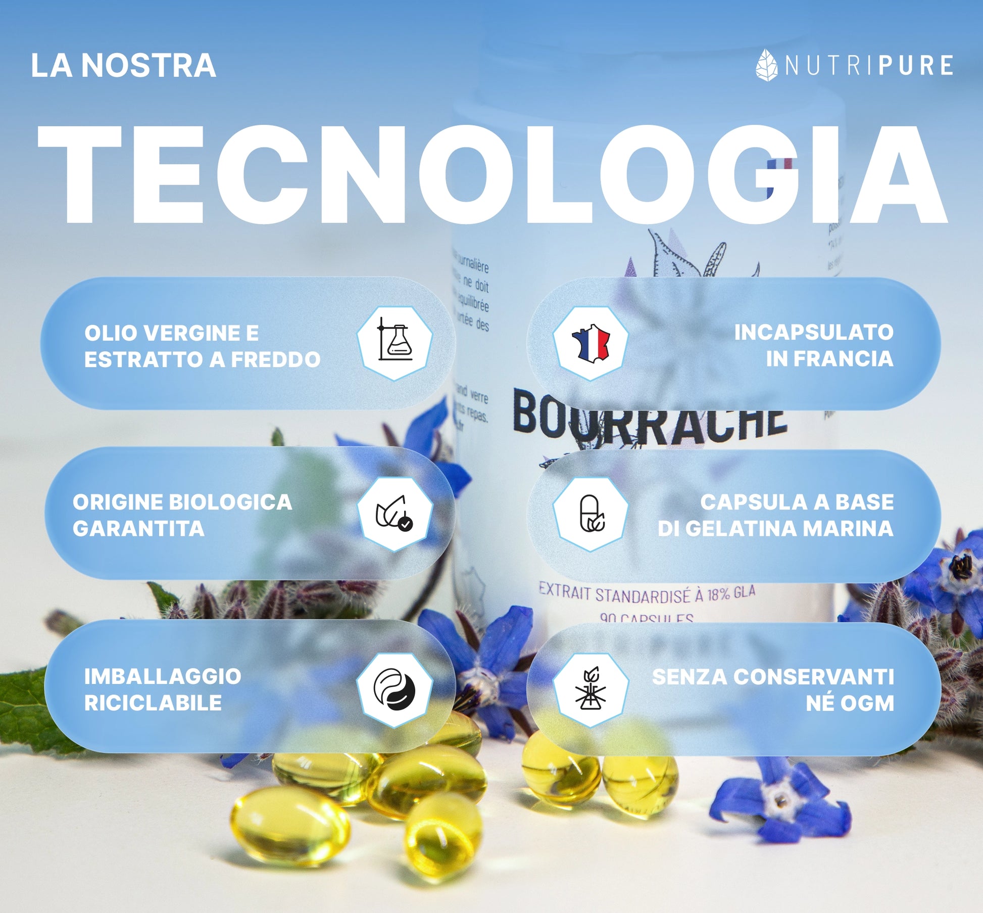 L'Olio di Borragine Nutripure è un eccezionale integratore alimentare biologico, ricco di Acido Gamma-Linolenico (GLA), un acido grasso essenziale omega-6 raro e prezioso per la salute della pelle.