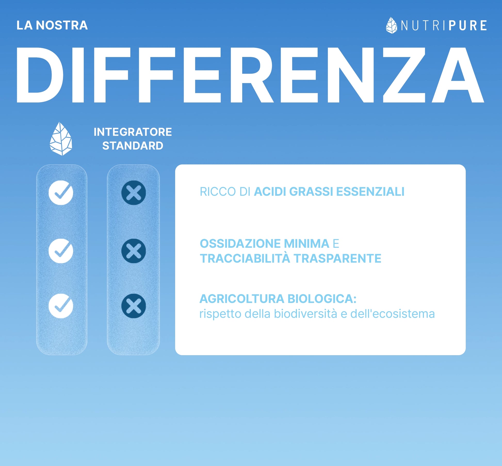 Un olio biologico, vergine ed estratto a freddo: questa è la garanzia di avere acidi grassi "polinsaturi" di buona qualità.